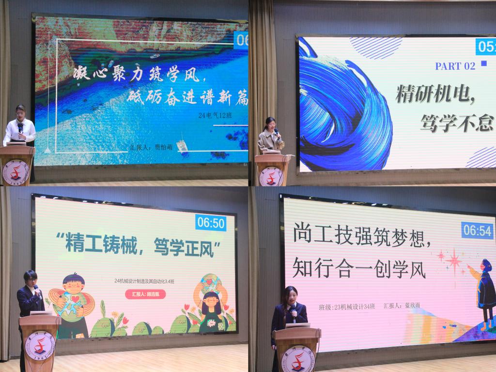 本次活动现场气氛高涨,14个参赛班级风采各异。各班代表通过生动讲述与展示,向全场师生回顾了过去一学年中的成长足迹与丰硕成果。他们聚焦学风建设的创新做法与突出亮点,充分展现出各班团结进取、追求卓越的班级风貌。评委们专注聆听每场汇报,并围绕学风建设、班级管理、实践创新、文体活动等多个维度进行了全面评审。