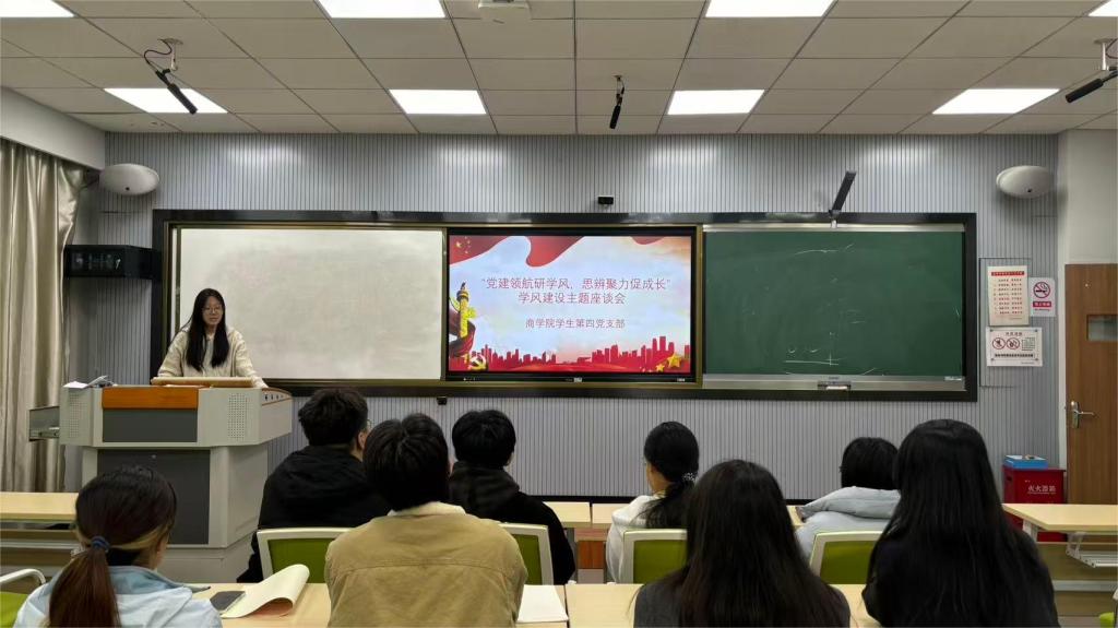 为充分发挥优秀党员榜样引领作用,推进学风建设,营造浓厚学习氛围,11月20日,商学院学生第四党支部在4-102教室召开“党建领航研学风,思辨聚力促成长”学风建设主题座谈会。会议由党支部书记赵之遐主持,金融专业各班学习委员参加。基于“课堂革命”,会议围绕席卡使用规范、前三排就座率、党员先锋模范发挥等问题进行深入交流,特邀支部周婉彤、郭艺颖等两位优秀的学生党员作学习经验分享。