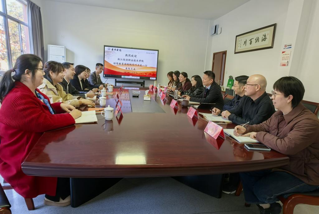 11月20日下午,浙江经济职业技术学院继续教育学院院长叶卫良一行来到我校继续教育学院开展调研交流活动。继续教育学院院长叶军、直属党支部书记金宏伟、副院长王瑜以及相关工作人员热情接待,双方在学院会议室举行了交流座谈会。