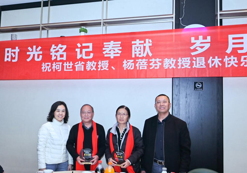 活动当晚,学院分工会为今年下半年退休的柯世省、杨蓓芬两位教授举行荣休仪式。院长赵凯和党委书记郑晓莉代表学院给两位教授佩戴象征热情、荣誉与吉祥的红围巾,并送上学院精心准备的荣休纪念品,以致敬和感谢他们数十年来对学院发展作出的贡献。赵凯代表学院致辞,深情回顾两位教授兢兢业业、潜心育人的执教生涯,指出学院发展的每一步都深深印刻着他们辛勤的足迹,凝聚着他们智慧的汗水,他们是学院事业发展的奠基者与贡献者,为青年同事树立了爱岗敬业、甘于奉献的楷模。赵凯表示,学院永远是他们温暖的家,希望两位教授常回家看看,继续为学院发展建言献策。最后,赵凯携全体教师真诚祝愿两位教授未来的每一天都充满阳光,健康、快乐、幸福永相随,现场气氛温馨而热烈。