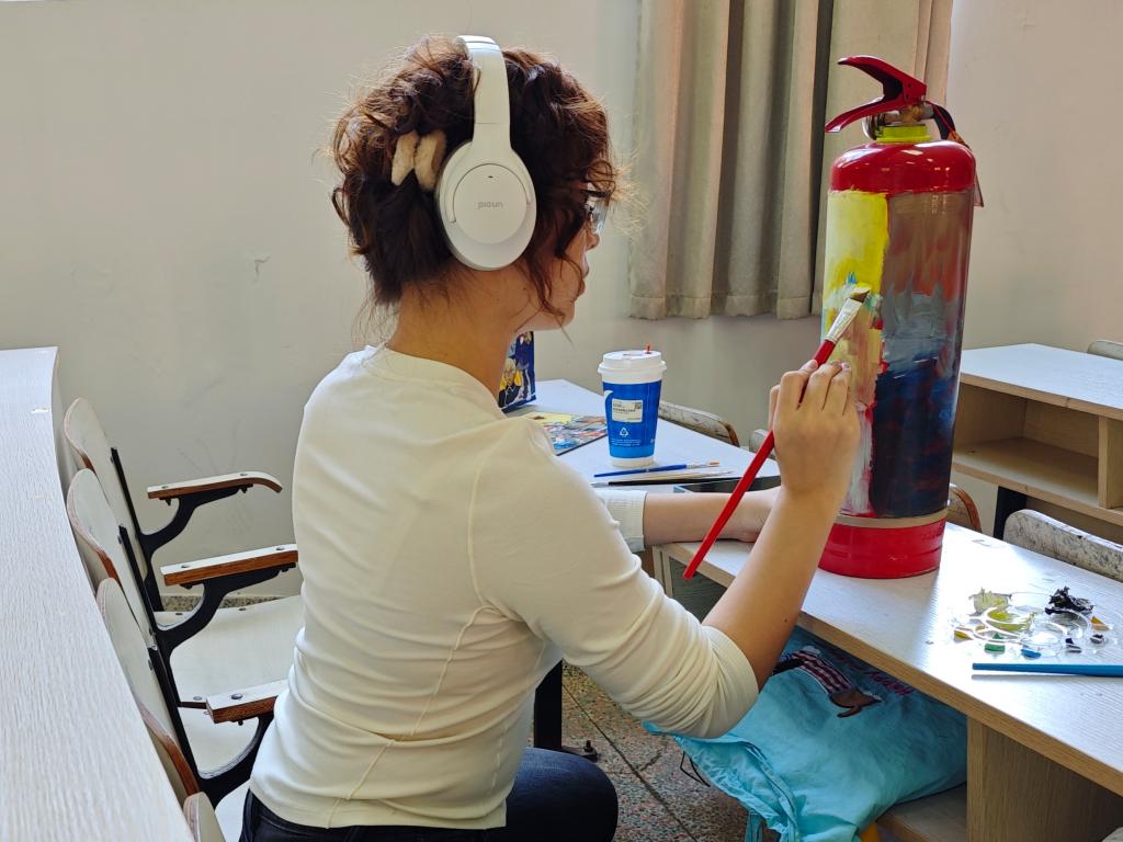 决赛现场,创作者们早早到场调试工具、构思布局,在灭火器瓶身上开启创意创作。创作者们围绕消防、禁毒、防诈骗国家安全等主题进行创作,有的选手先以铅笔轻描轮廓,反复勾勒消防元素与艺术图案的融合细节,有的团队分工协作,一人负责构图、一人调配颜料,默契配合中推进作品成形,选手们运用画笔,在灭火器上挥洒创意,用鲜明色块突出安全警示,用灵动的笔触让瓶上的形象活灵活现。