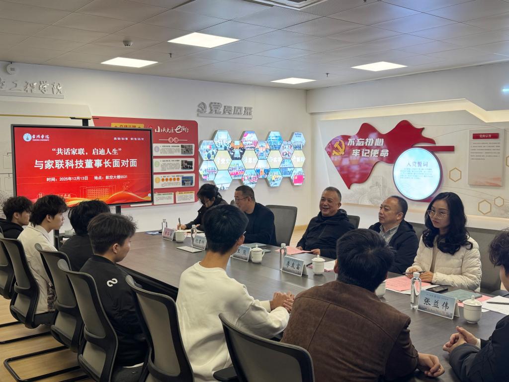 12月13日,智能制造(航空工程)学院2025年“家联班”座谈会在航空大楼S531举行。本次座谈会以“共话家联,启迪人生——与家联科技董事长面对面”为主题,邀请宁波家联科技股份有限公司董事长王熊莅临现场,与学院师生展开深入交流。学院党委书记李友富主持会议,副院长倪君辉、学工办主任刘湘、辅导员张益伟、黄洛佳及“家联班”全体学生共同参会。