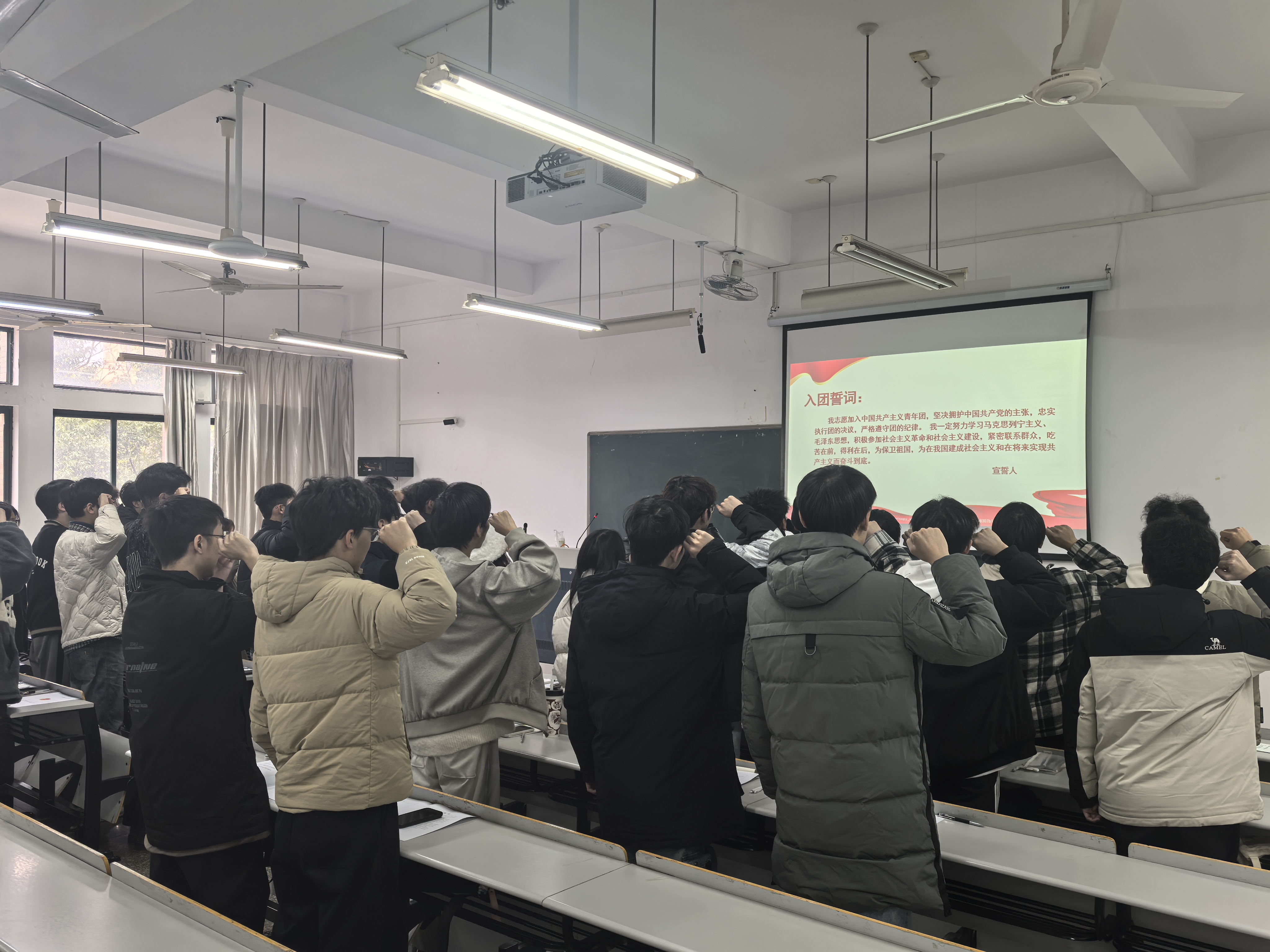全体新团员肃然肃立,庄严宣誓。他们高举右拳,誓言铿锵,以青春之声重温入团誓词,彰显着继承光荣传统的坚定信念与青春担当。