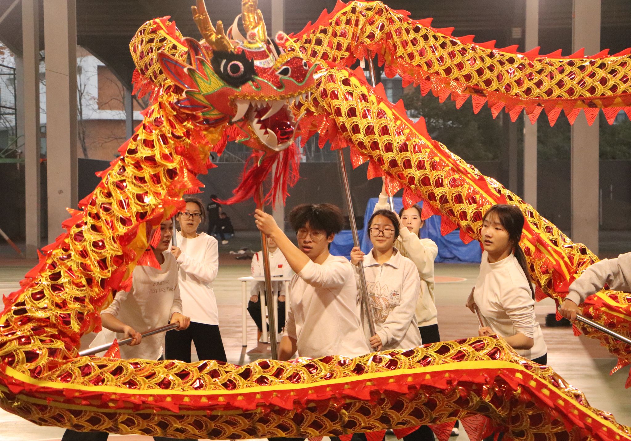 伴随着激昂的鼓点,各学院代表队依次登场。长龙在队员手中时而盘旋升空,蛟龙探云,昂首摆尾间尽显磅礴气势;时而蜿蜒穿梭,游龙戏水,腾挪翻转中流露灵动韵味。金鳞闪耀的龙身随鼓点起伏,队员们步调一致、默契配合,将龙的威猛与柔美完美融合,每一个跳跃、翻滚的动作都赢得满堂喝彩。评委们凝神观察,依据动作难度、衔接流畅度、队形编排等维度细致打分。