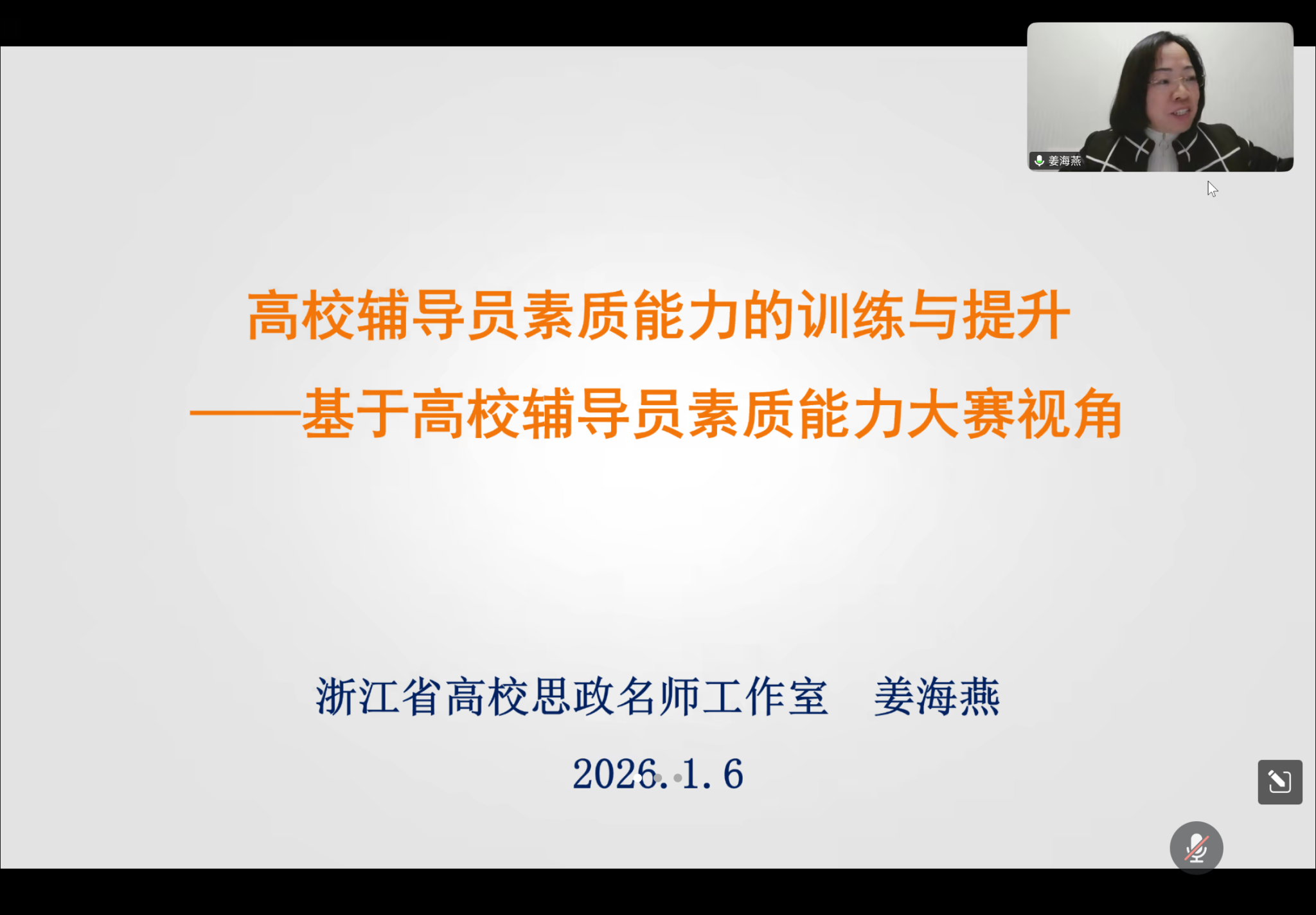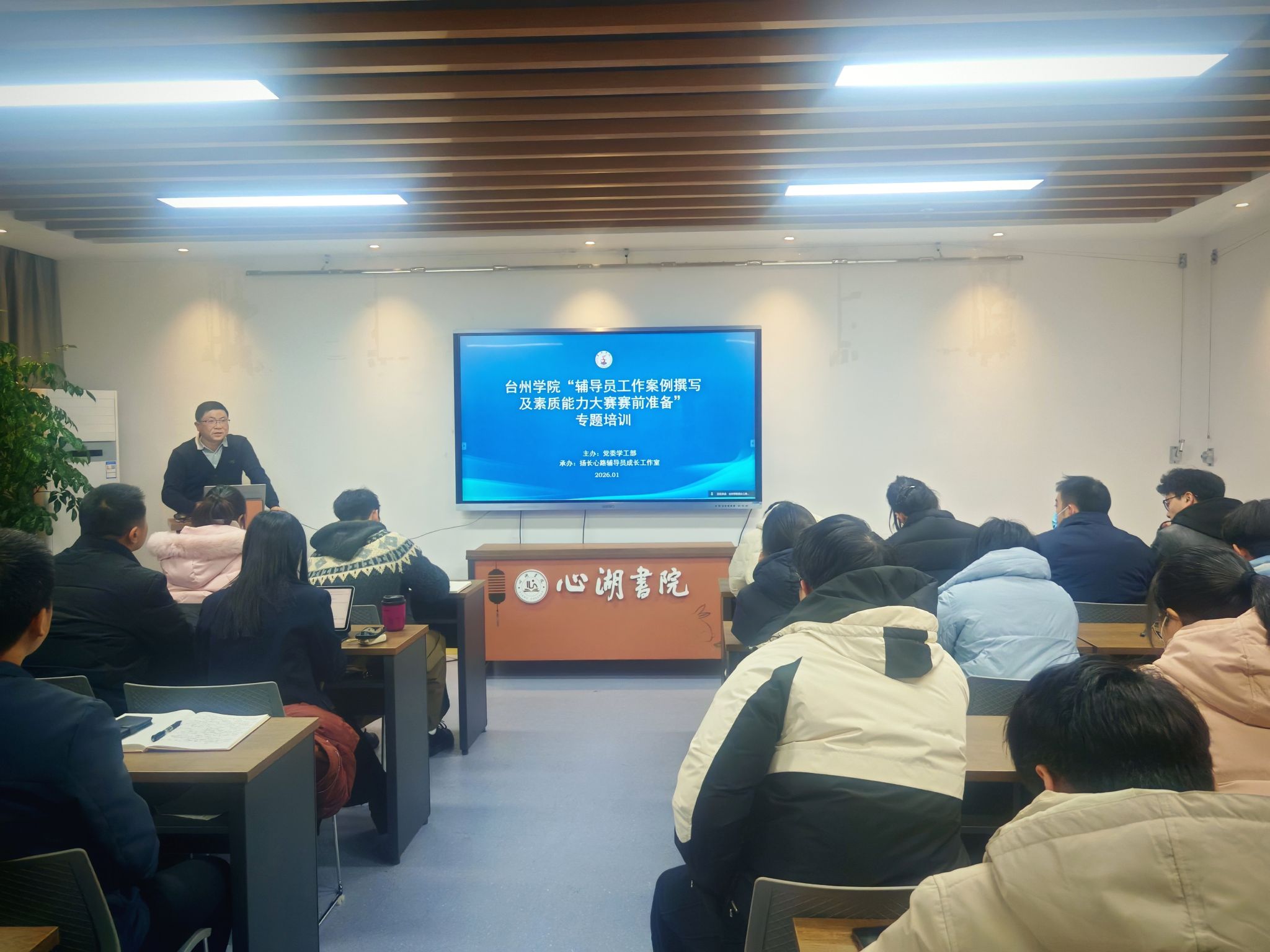 为加强辅导员队伍专业化建设,提升工作案例撰写水平与职业能力素养,1月6日,校党委学工部组织、扬长心路辅导员成长工作室承办的专题培训顺利举行。温州大学党委学工部部长姜海燕受邀以腾讯会议形式作辅导报告,全校各二级学院、台州两所兄弟院校的近100名辅导员代表线上线下同步参会。