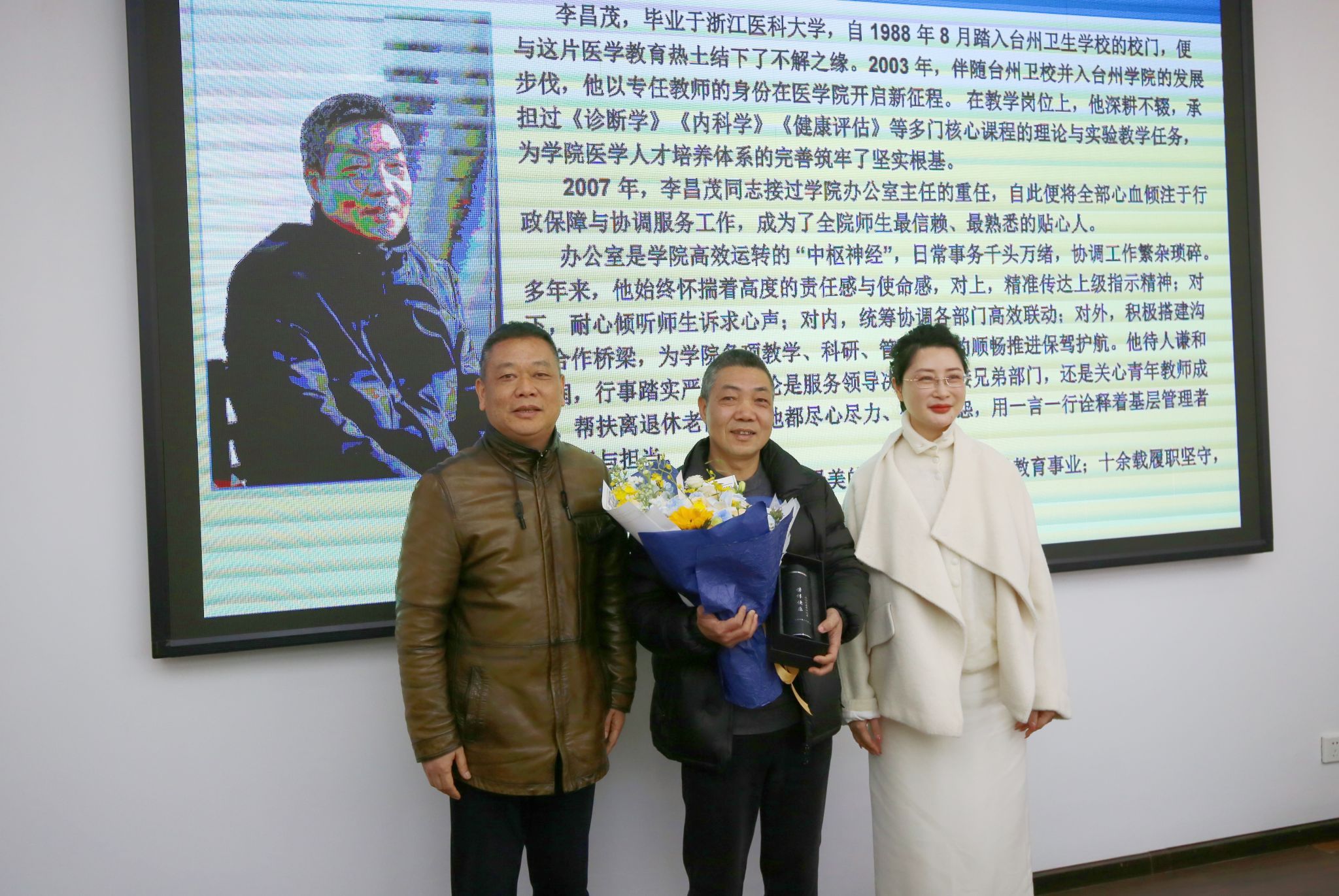 座谈会伊始,林海斌书记与周敏副书记代表学院为上月退休的教师李昌茂举行了荣休仪式。林海斌代表全院师生,向一直以来关心和支持学院发展的各位退休教师表示衷心感谢。他从师资建设、教学提升、科研突破、实验条件改善、学生培养、党建与对外合作等方面,系统汇报了医学院2025年取得的进展,并介绍了2026年的工作规划与发展愿景。他表示,老同志是学院最宝贵的财富,恳请大家继续发挥经验和智慧,为学院高质量发展建言献策、指引方向,携手开创学院更加美好的未来。