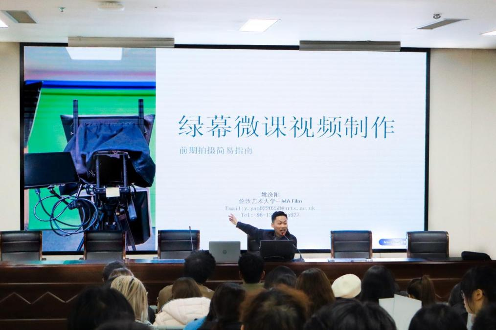 为提升实习生的信息化教学技能,会议还特别安排了专题培训环节。学长姚逸阳结合自身留学经历与专业特长,开展了绿幕视频拍摄技术专题讲座,分享了“前期解决优于后期处理”的实操理念,和“成长模型”构建经验。