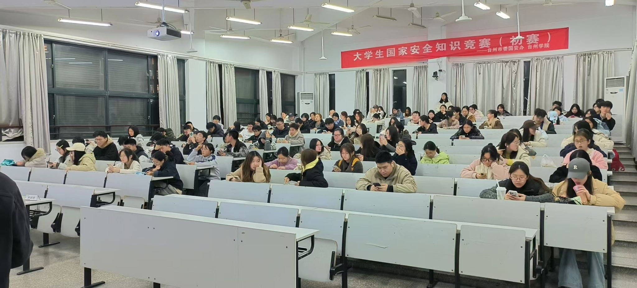 3月27日晚,台州学院大学生国家安全知识测试在临海校区2102、2201、A1和A3教室举行。本次测试由台州市委国安办主办、台州学院承办,以“统筹发展和安全 护航‘十五五’新征程”为主题,旨在深入贯彻总体国家安全观,进一步增强青年学子的国家安全意识。