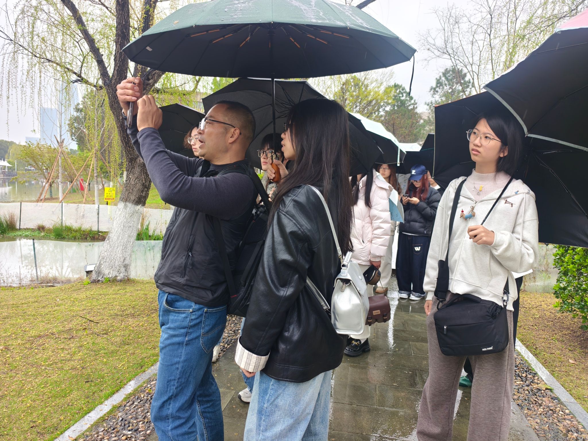 培训过程中,参训成员认真聆听、积极记录,主动围绕日常拍摄中遇到的难点提问,卢明光逐一耐心解答,结合具体案例给出可操作的改进建议。理论讲解结束后,卢明光带领全体参训成员前往校内林荫道、教学楼、图书馆等标志性场景,开展外景实操拍摄。活动当日虽遇降雨,但丝毫没有影响成员们的参与热情。