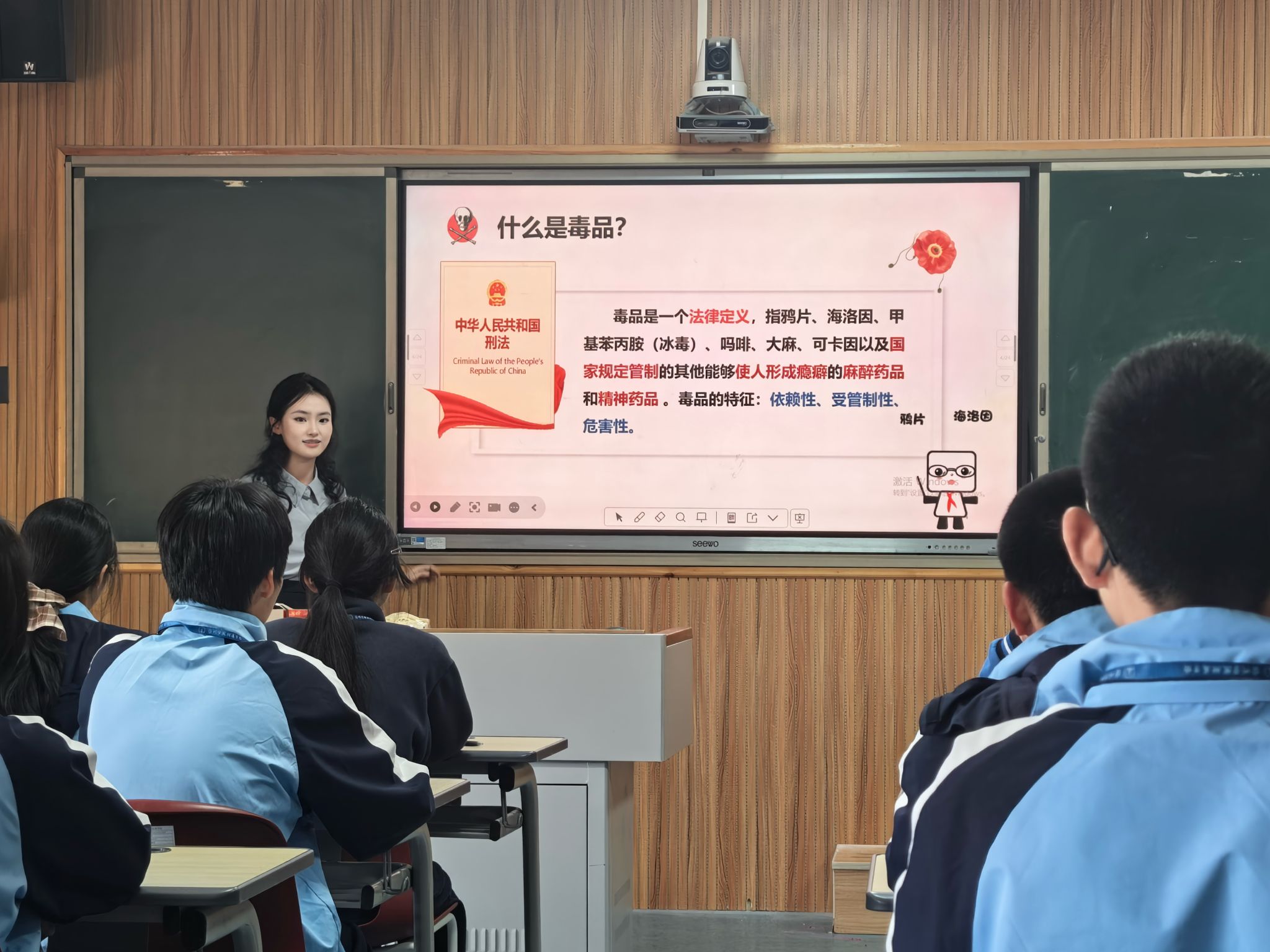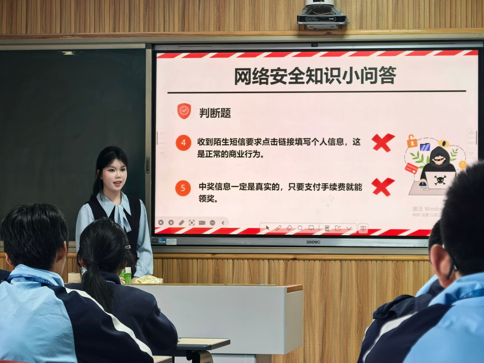 宣讲现场,各板块内容各有亮点、精彩纷呈,让学生在沉浸式体验中收获安全知识。宣讲团成员李岚心以“远离毒品,守护生命”为主题,通过图文展示、数据解读清晰呈现常见毒品的种类与危害,结合真实涉毒案例敲响警钟,呼吁同学们树立防毒拒毒意识,筑牢生命安全防线;朱孙竹用通俗易懂的语言拆解国家安全的丰富内涵,通过互动讨论的形式引导主动思考,深刻理解国家安全与个人的紧密联系,让“国家安全,人人有责”的理念深深扎根心中;沈奕涵聚焦青少年日常易遭遇的网络安全问题,精准拆解游戏充值、网络购物等常见网络骗局的套路手段,手把手传授“八个凡是”防范技巧,提升网络反诈能力;程一然则以“做自己情绪的小主人”为核心,分享实用的情绪识别方法与压力调节技巧,精心设计的“情绪树洞”互动环节,让他们敢于表达内心感受,学会自我关怀与同伴互助,提升心理健康素养。
