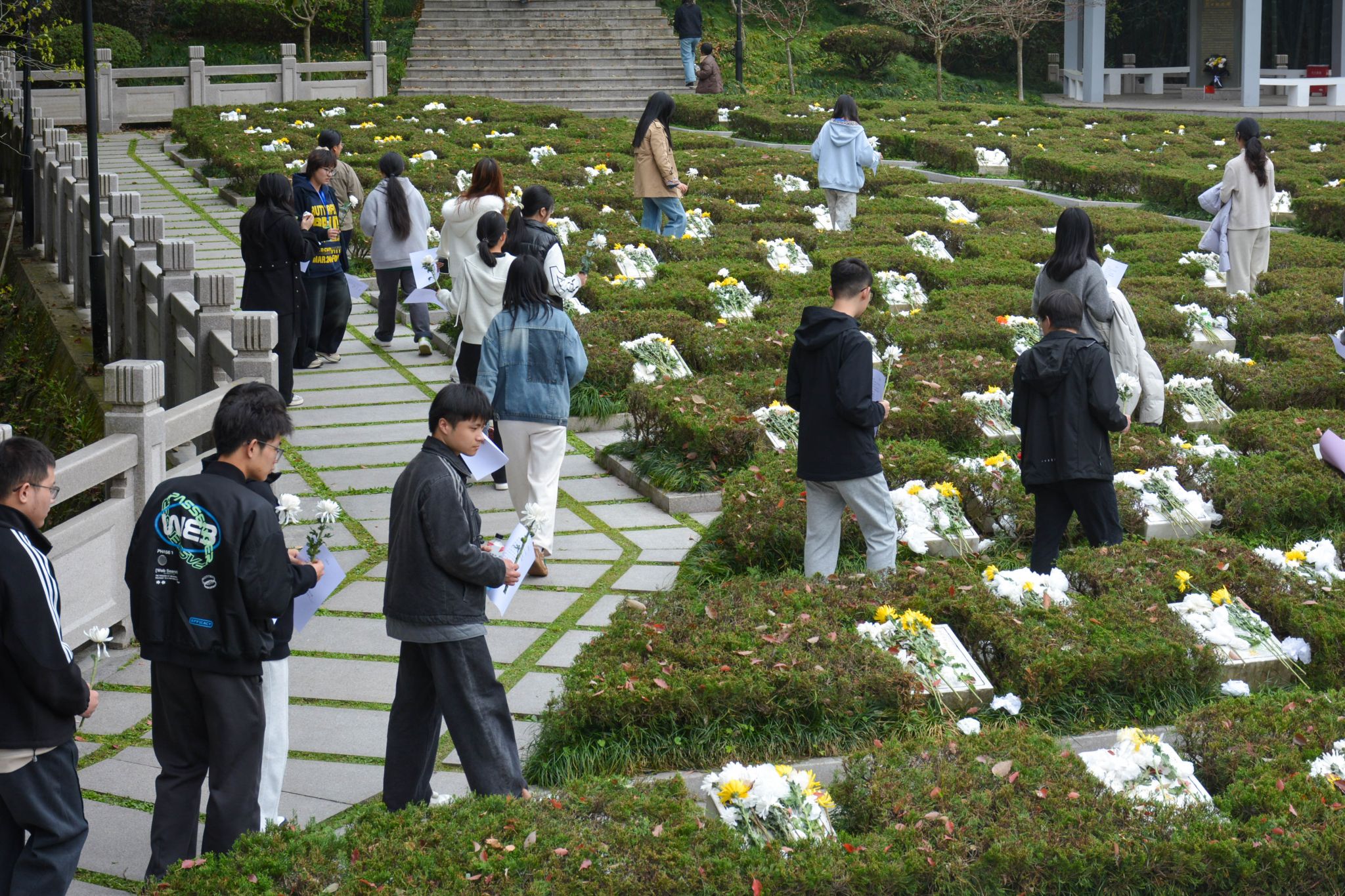 午后,陵园静谧肃穆,氛围庄重安然,在场师生怀着无比崇敬的心情列队集结,有序开展祭扫仪式。仪式上,志愿者代表缓步走向烈士纪念碑,郑重敬献花圈;全体人员肃立默哀,低沉的哀思在细雨中传递,深切缅怀先烈们为民族独立、人民解放抛头颅、洒热血的英勇壮举。随后,同学们依次走到烈士墓碑前,敬献洁白鲜花,轻轻擦拭墓碑,在心底默念追思,真切感悟“青山处处埋忠骨,何须马革裹尸还”的赤诚与担当。