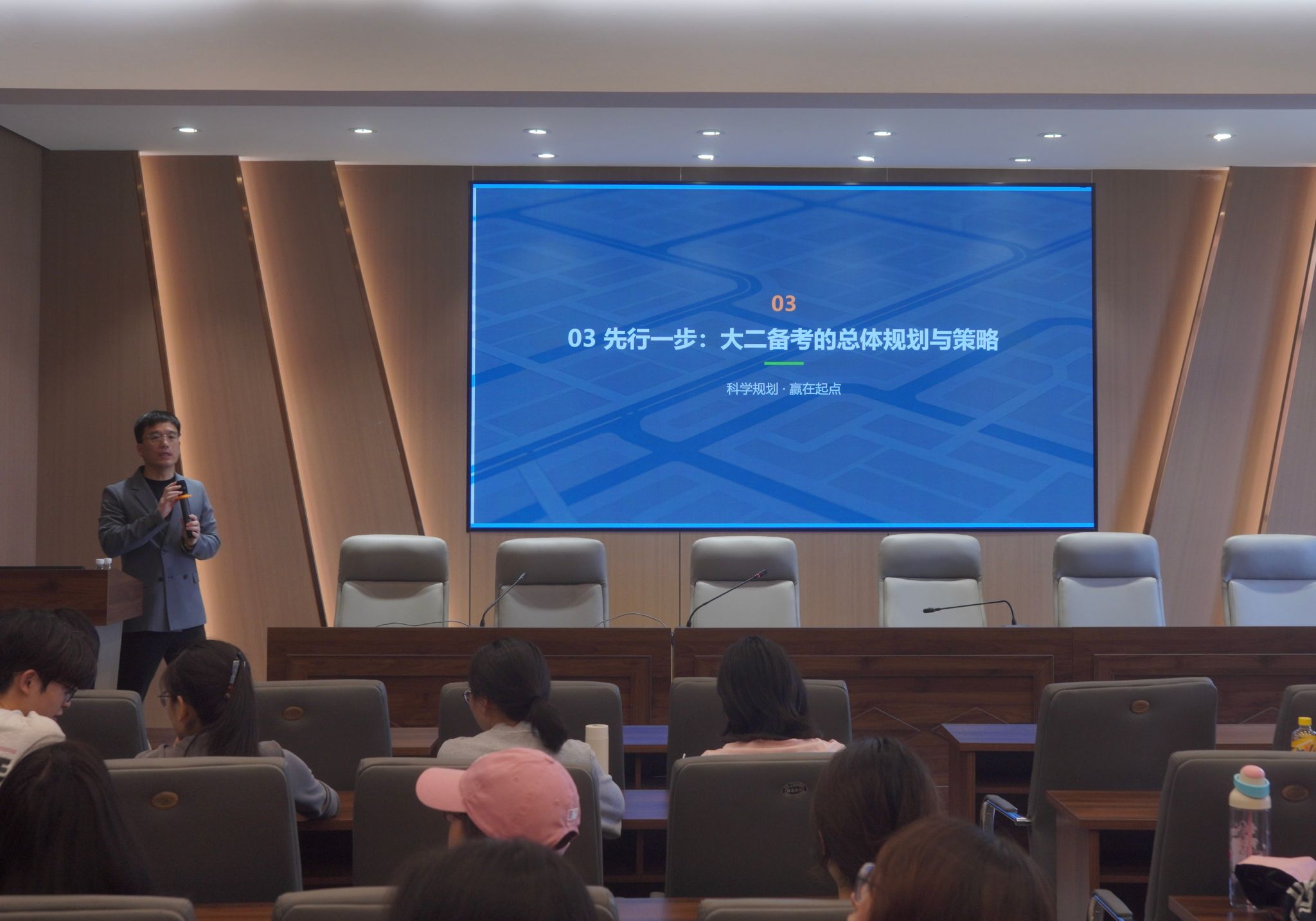讲座围绕当前就业形势、考研价值意义、备考整体规划、学科复习方法、院校选择策略及跨考方向等内容展开。徐学佩结合各专业特点进行针对性讲解:在学前教育专场,他分析了行业编制缩减、竞争加剧的困境,强调考研对提升个人竞争力和拓宽就业渠道的作用;小学教育专场聚焦院校选择与专业课知识体系构建;体育教育专场则介绍了“冲、稳、保”择校策略及基础夯实方法。