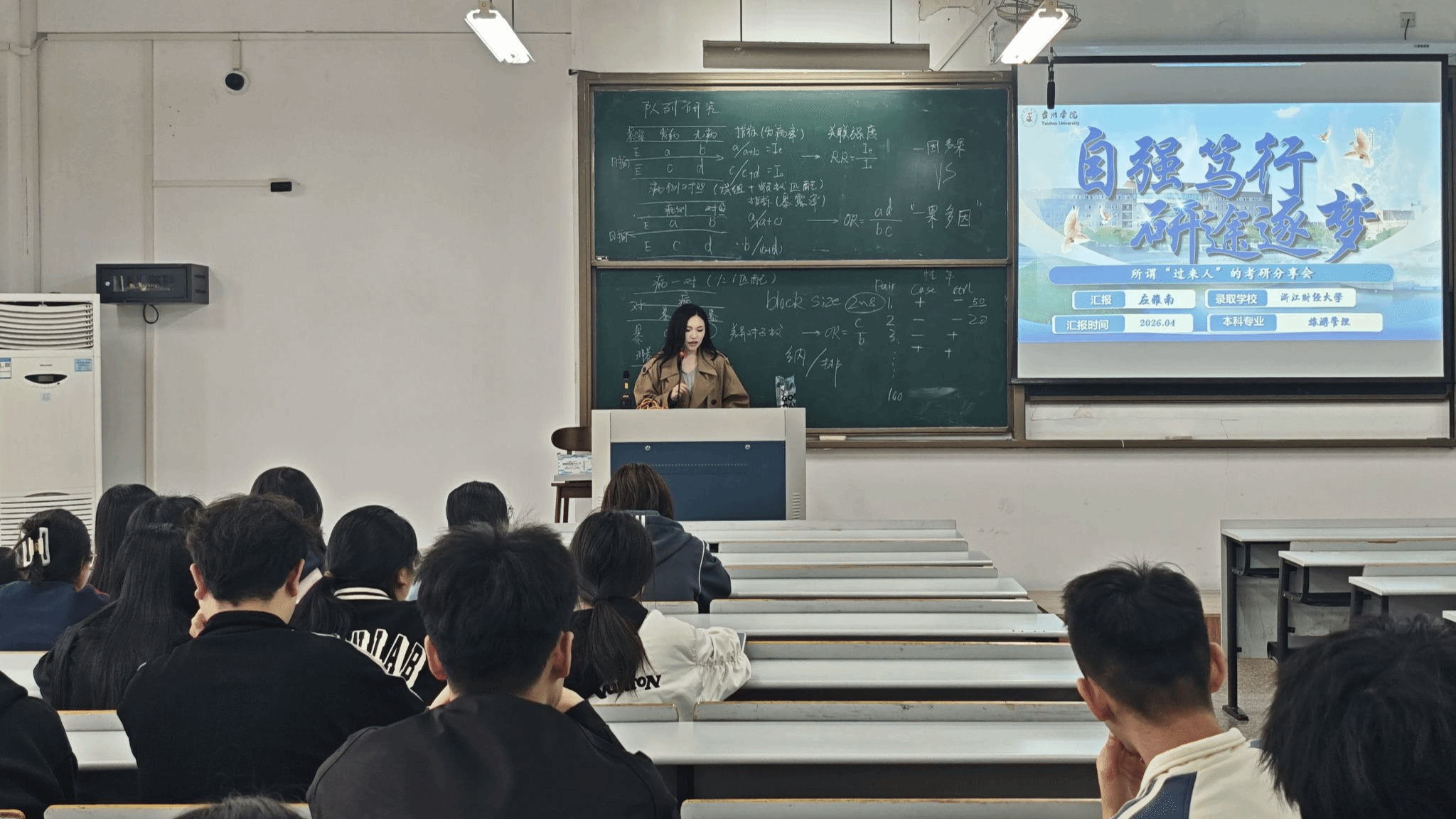 分享会上,应雅南结合自身备考经历,从个人背景、院校选择、备考规划、材料准备四大维度展开系统分享。她坦诚回顾了一战失利后及时调整备考策略、最终成功上岸浙江财经大学的历程,着重强调正视自身短板、理性选择院校的重要性。在院校选择方面,她建议同学们结合地域偏好、院校层次、专业实力等因素综合考量,精准定位目标院校;针对备考核心环节,她从英语、数学、政治、专业课四门科目入手,细致拆解学习重点与时间分配方案,推荐优质学习资源,并着重提醒同学们注重日常复盘总结与真题模拟训练,夯实学习成效。