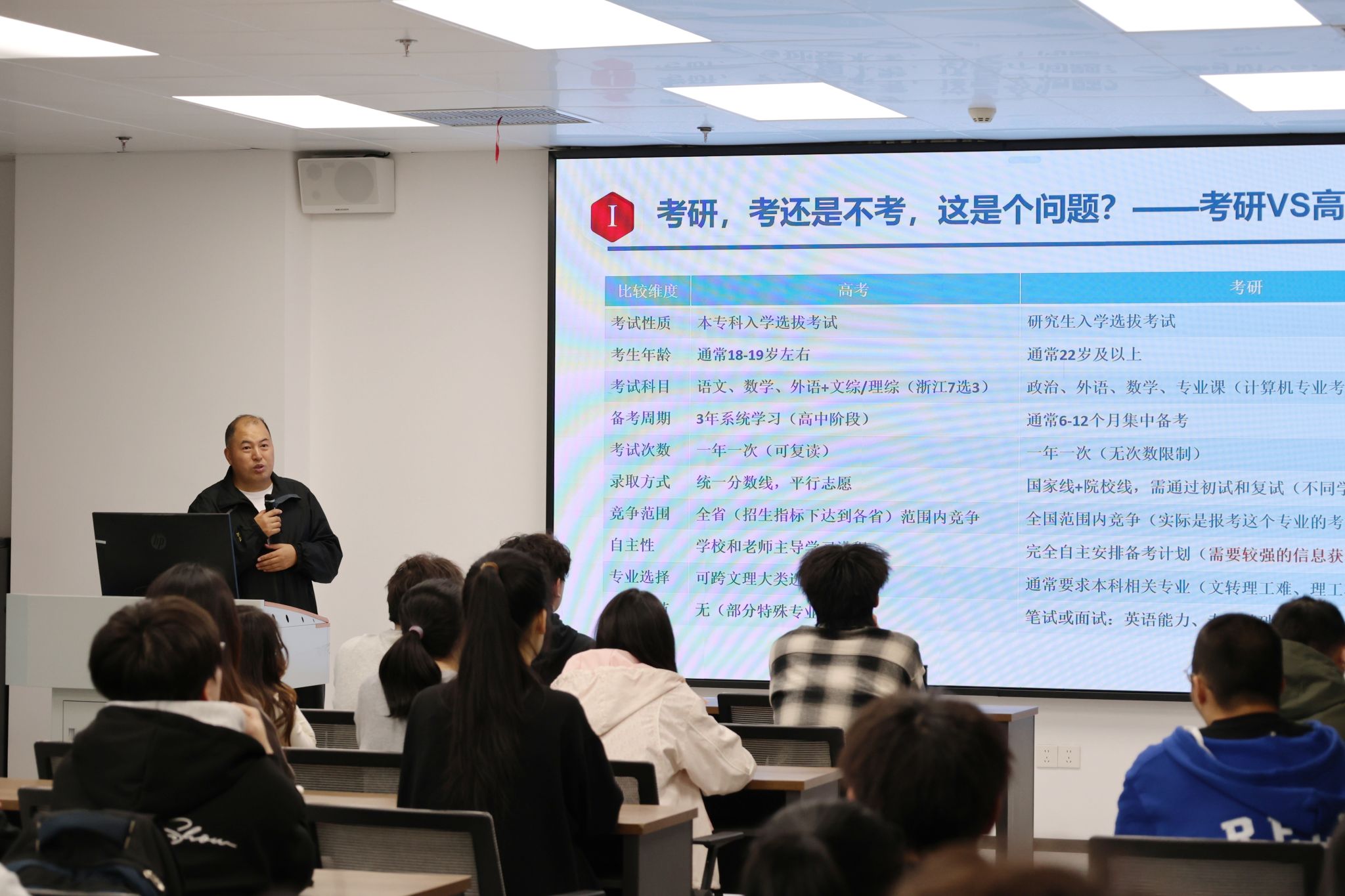随后,副院长郭文平围绕考研工作开展专题指导。他结合大数据专业考研趋势、历年录取情况,从考研目标院校选择、备考时间规划、各科目复习重点、报名流程及注意事项等方面进行了全面细致的讲解,针对性解答了学生在考研备考中可能遇到的困惑,鼓励有考研意向的同学坚定信心、科学备考、全力以赴。