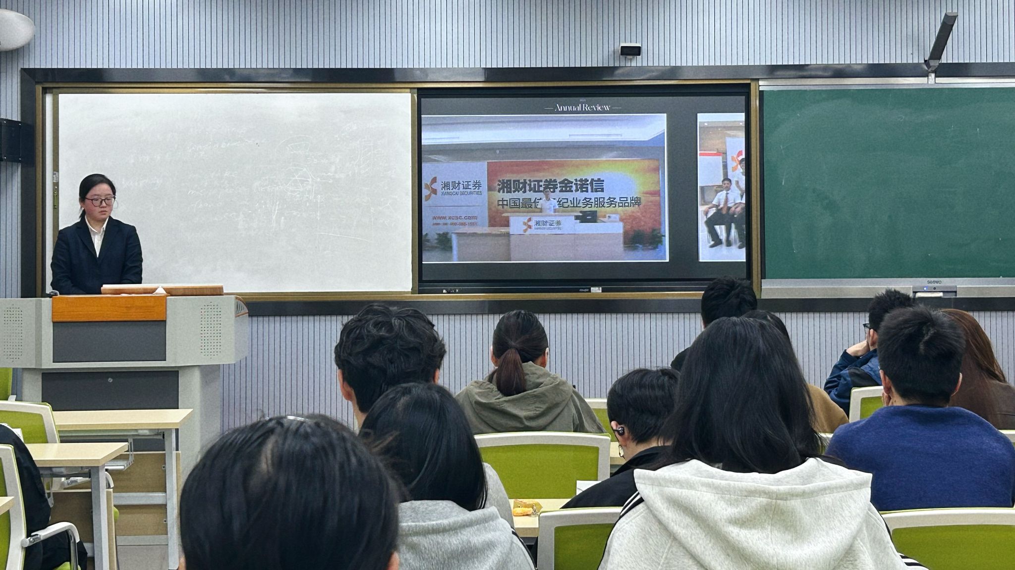 为充分发挥学生党支部在就业工作中的引领作用,帮助学生拓展职业认知、深入了解证券行业,4月21日,商学院学生第四党支部承办“职引未来”高质量就业活动第七十四期,在4-102教室举行优秀校友证券从业经验分享会,吸引40余位金融专业学生代表参加。活动特邀21金融学校友、湘财证券中心大道营业部理财经理陈晨担任主讲嘉宾,围绕应届求职面试、证券从业人员日常工作及相关从业证书考取等核心内容展开全面分享,为在场学生答疑解惑。