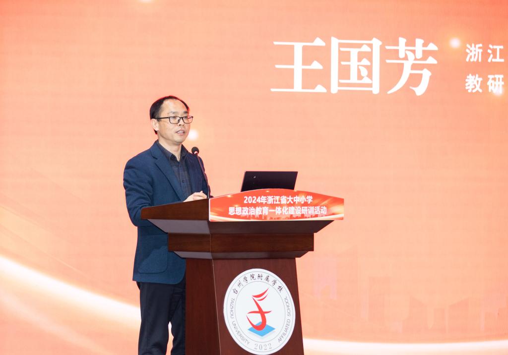 研修活动最后,浙江省教育厅教研室教研员王国芳进行总结。王国芳老师用“12345”5个字来对整个活动进行了概括。“一”就是一个主题,活动围绕大中小学思政教育一体化建设的地方创新实践这个主题展开;“二”是两个会场,一个是台州学院附属学校的会场,一个是新疆的会场,两个会场参加的老师600多位老师;“三”是三个专家报告:张志丹教授、李荆老师、张庆华教授;“四”是四场教学反思课;“五”就是五位专家的点评。王国芳认为,推进思想政治教育一体化建设,需要聚焦浙江,结合地方实际,同时也需要顶层系统设计和地方创新实践,要攻坚克难,勇于改变,才能够打造浙江思政特色品牌,提升思政教育一体化建设的高度和亮度。