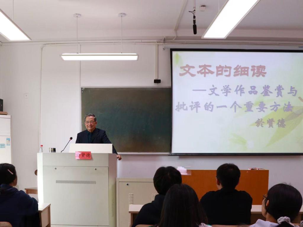 10月24日上午,广东外语外贸大学研究员、教授於贤德应人文学院邀请,在1107教室为师生带来了一场题为“文本的细读——文学作品鉴赏与批评”的学术讲座。