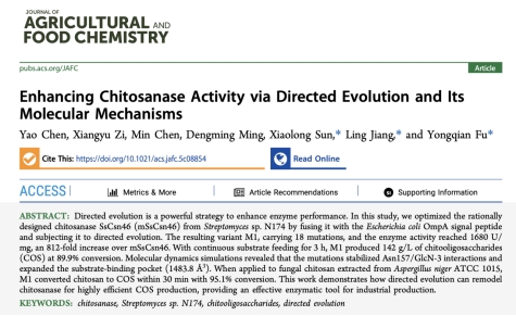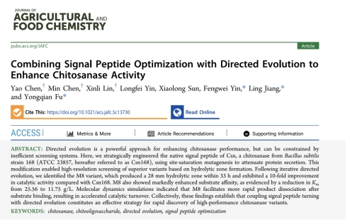 近日,生命科学学院付永前教授团队联合南京工业大学江凌教授,在农林与食品领域顶级期刊《Journal of Agricultural and Food Chemistry》(IF:6.2,中科院一区 TOP)上连续发表两篇关于壳聚糖酶的实验研究论文。
