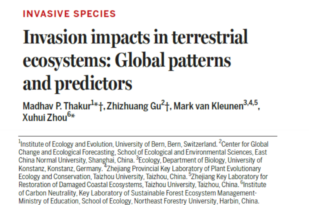 近日,我校高等研究院全球变化与进化生态学研究所Mark van Kleunen教授作为重要共同作者,在国际顶级学术期刊《Science》上发表了题为“Invasion impacts in terrestrial ecosystems: Global patterns and predictors”(陆地生态系统中的入侵影响:全球格局与预测因子)的研究论文。该研究由瑞士伯尔尼大学Madhav P.Thakur团队、华东师范大学顾志壮团队、我校高等研究院Mark van Kleunen、东北林业大学周旭辉团队等全球多个顶尖科研机构合作完成,台州学院全省受损生态系统修复重点实验室、台州学院浙江省植物进化生态学与保护重点实验室为该论文的共同署名单位。