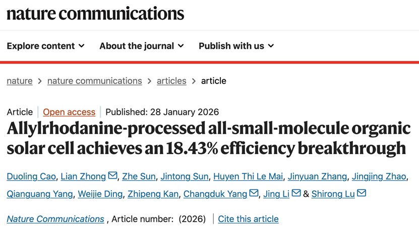 近日,材料科学与工程学院陆仕荣教授团队在权威期刊《Nature Communications》上发表题为“Allylrhodanine-processed all-small-molecule organic solar cell achieves an 18.43% efficiency breakthrough”的研究论文。陆仕荣教授、钟恋特聘研究员为第一通讯作者,联合培养博士生曹多玲为第一作者,台州学院为第一单位。