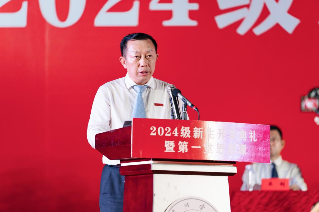 校长、党委副书记乐传永代表学校对全体新生的到来表示热烈欢迎,并以“知行合一书写不负时代的青春华章”深切寄语全体2024级新生,祝愿大家德有所养、学有所成、万事顺意。乐传永指出,台州独特的地理位置铸就了柔美与刚毅并济、温婉与豪迈相融的独特气质,是一座值得深深扎根的城市,也是千年之间无数文人墨客盛赞之地。同时,作为中国民营经济发祥地、股份合作经济发源地、市场经济先发地,台州连续三年在春晚“出圈”,成为深受年轻人喜爱的旅游新地标,期待大家在大学期间有机会发现、打卡糯叽叽、鲜哒哒的台州美味。乐传永回望学校的百年奋斗史,指出学校作为台州的“最高学府”,从1958年开办高等教育以来,先后实现了从专科教育到本科教育再到研究生教育、从单一的师范教育到综合性教育再到做强理工、做优师范和医学、做特人文社科的华丽蝶变,“澡身浴德、修业及时”的校训精神始终引领着一代又一代台院人持续拼搏、接力奋斗。