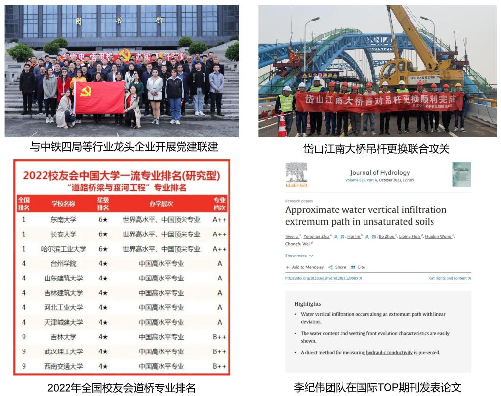 广拓展,以“党建联建”深耕“朋友圈”,赋能专业学科高质量发展。道桥教工党支部坚持党建与业务双融双促,明确“组织共建、资源共享、品牌共创、发展共谋、合作共赢”的理念,广泛开展党建联建活动,打造“政-企-行业协会-学校-实验平台”五位一体的产教融合协同育人模式,着力培育“道桥新人”,一方面为高技术人才与企业搭起产学研相结合的新路子,一方面也是将党建工作融入人才培养第一线,被省、厅领导誉为桥梁管理和人才培养的“台州模式”。支部成员领衔桥梁检测加固评估与监控技术研究、路基工程智能建造与养护技术等4支科研团队,推动“有组织的科研”,发挥辐射带动作用,提升学科组教师科研整体水平。支部党员发表高质量科研论文48篇,其中中科院一区TOP 9篇;获专利授权34项,软件著作权3项。参与横向课题年均经费达300万元,其中地铁工程爆破监测项目单项经费达463万。获得中国公路建设行业协会科学技术进步奖一等奖1项,浙江省公路学会科技进步奖1项,台州市科学技术进步三等奖1项;主持或参与国家自然科学基金项目2项,获得浙江省教学改革项目研究5项,教育部产教协同项目2项。在2022年校友会中国大学一流专业排名榜道路桥梁与渡河工程专业排名(研究型)中,道桥专业位列全国第四。