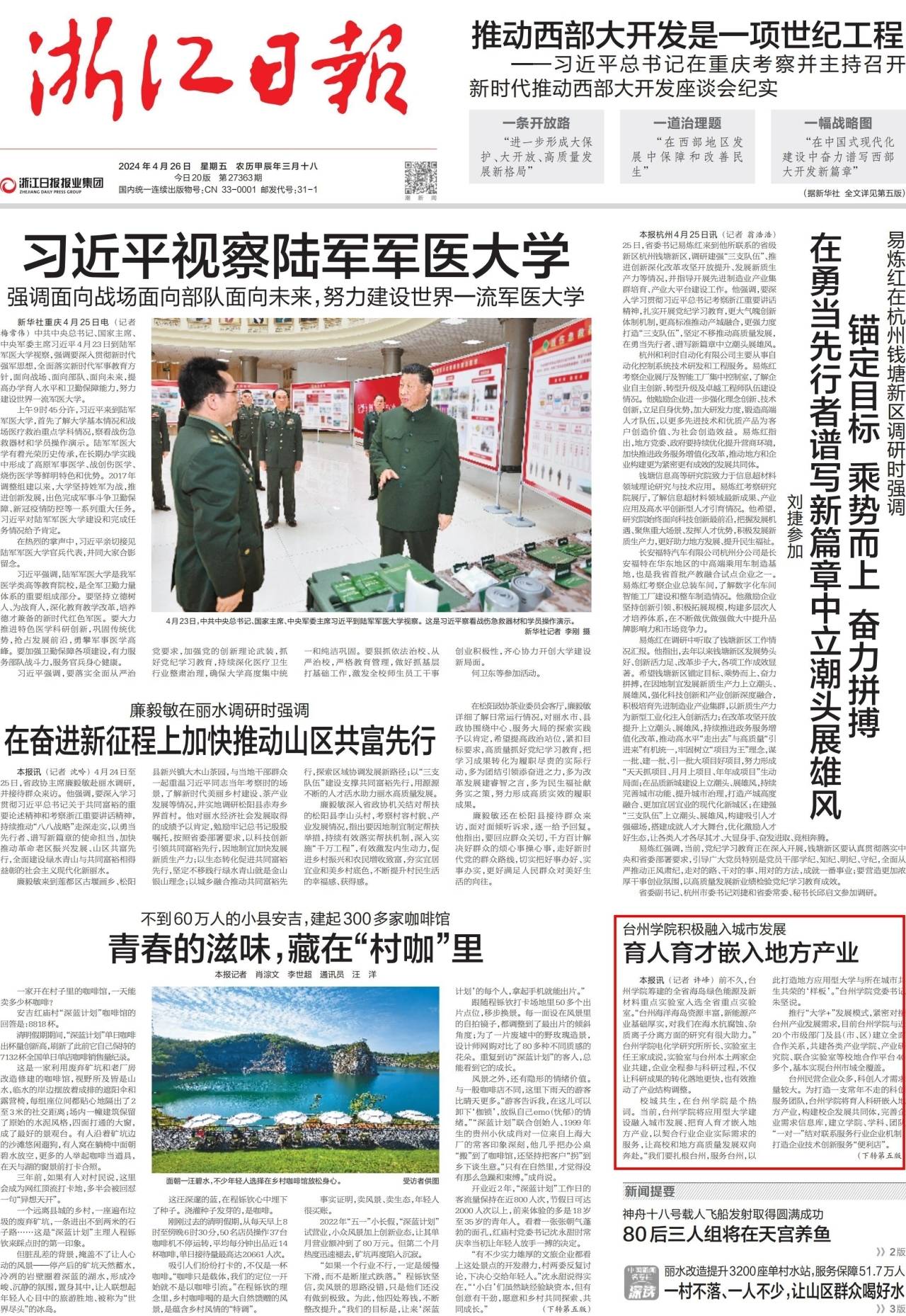 今天(4月26日),在台州学院第四次党代会胜利闭幕之际,《浙江日报》头版刊发《台州学院积极融入城市发展 育人育才嵌入地方产业》,报道台州学院坚持校城共生,将应用型大学建设融入台州城市发展,把育人育才嵌入地方产业,与地方高质量发展双向奔赴。现将全文转载如下。