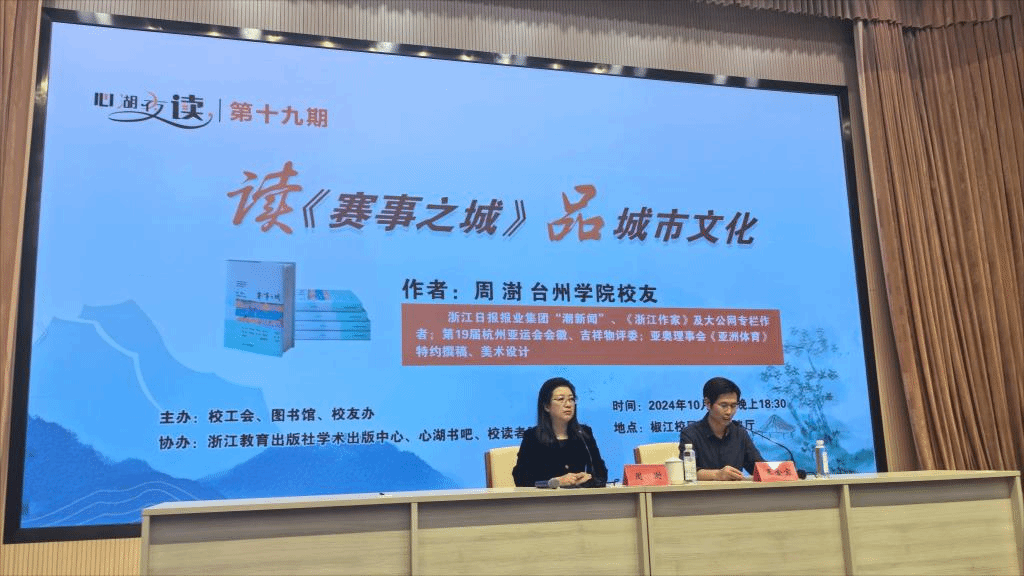 10月18日晚,校工会、图书馆、校办(校友办)在椒江校区国际会议厅联合举办第十九期“心湖夜读”活动——“读《赛事之城》 品城市文化”阅读分享会。该书作者、我校中文系校友周澍亲临现场分享交流,200余名师生参加活动。分享会由校工会专职副主席王金宝主持。