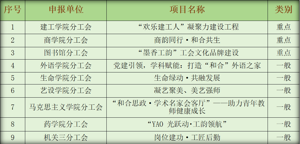 校工会于4月初发出通知后,各二级工会高度重视,结合实际,精心策划,总结凝练,共申报项目9项。内容涵盖教师党建思政、职业发展、文化育人、文体活动等多个维度,充分彰显了“和合台院、活力台院、美丽台院、幸福台院”的工作理念,生动展现了学校在教职工文化建设方面的多元探索与创新实践,为构建独具特色的校园文化生态注入了新动力。