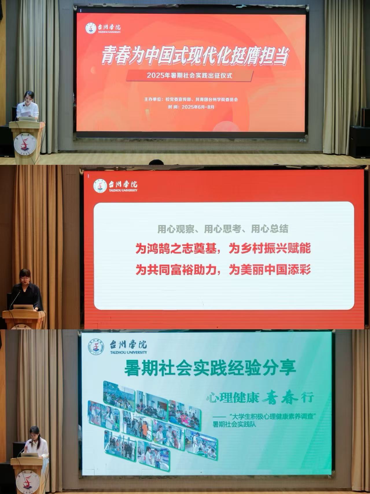 今年,我校以“青春为中国式现代化挺膺担当”为主题,根据浙江省和台州市经济社会发展的实际需要,采取点面结合的方式,点上以各二级学院、职能部门为单位,组织114支实践队伍,开展集中性暑期社会实践;面上由同学们返回居住地后,开展“三下乡”“返家乡”“千人千岗”等专题实践活动。