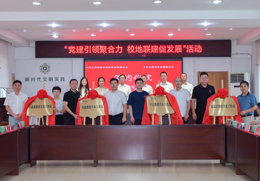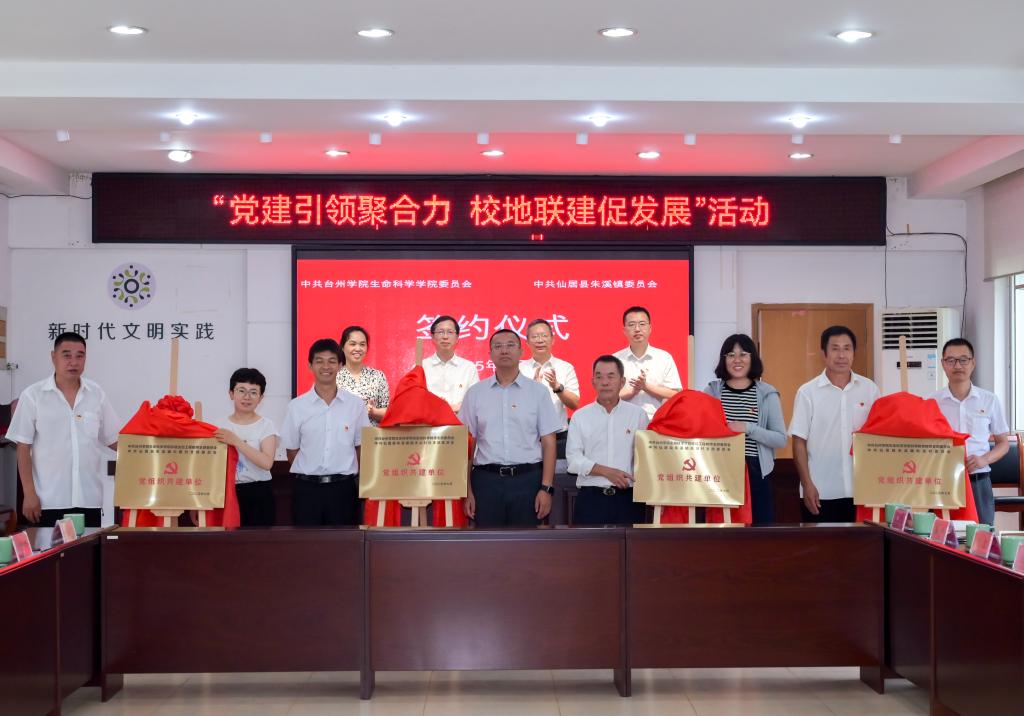 梁巍、郑晓莉代表双方签署了党建联建校地深度合作协议书。生命科学学院四名教师党支部书记与朱溪镇四个行政村党组织书记共同为共建党组织揭牌。