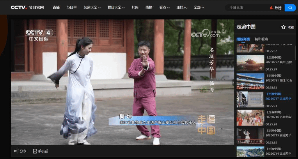 7月17日晚,中央电视台《走遍中国》之“名城芳华——临海”正式播出,我校教师教育(体育)学院樊坤副教授及其缩山拳团队受邀参加。