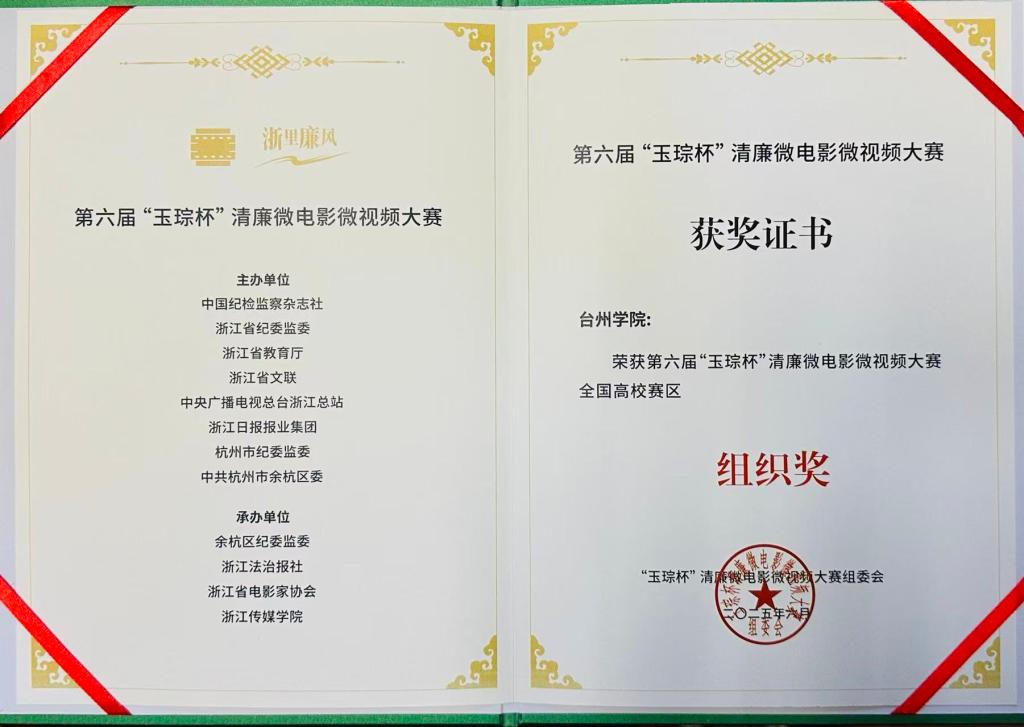 日前,由中国纪检监察杂志社、浙江省纪委监委、浙江省教育厅、浙江省文联、中央广播电视总台浙江总站和浙江日报报业集团等单位主办的“光影@廉映于心”第六届“玉琮杯”清廉微电影微视频大赛颁奖活动在杭州举行。我校马克思主义学院报送的作品《一出好戏》获得高校赛区微电影类铜奖,药学院报送的作品《抵制诱惑 坚守正道》获得高校赛区微视频类铜奖,同时学校获得全国高校赛区组织奖。