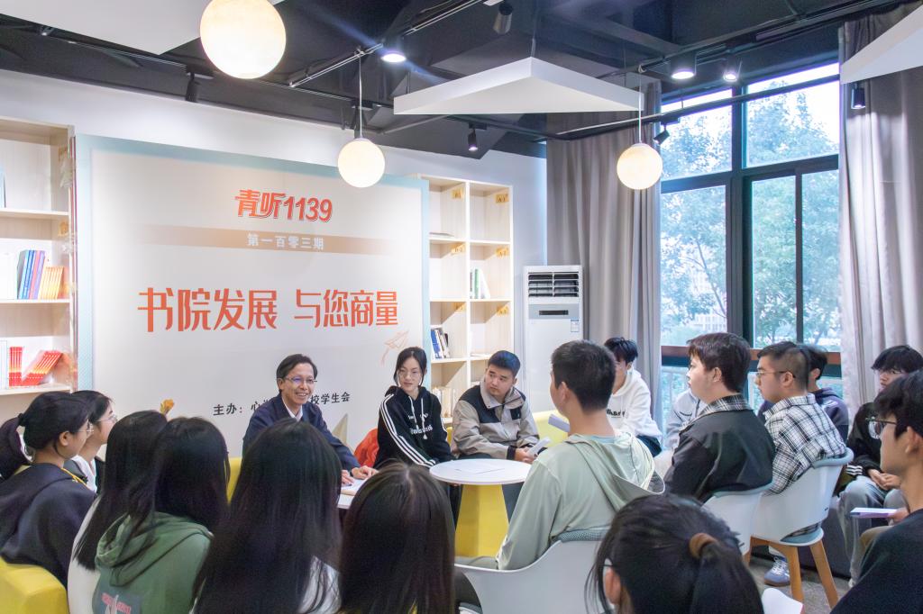 10月30日下午,由心湖书院与校学生会联合主办的“青听1139”系列活动第103期,在台州学院椒江校区心湖书院顺利举行。校党委副书记项凤日应邀出席,校学工部、团委及心湖书院相关领导老师陪同参与,与心湖书院25名学子面对面交流,共探书院事业发展新路径。