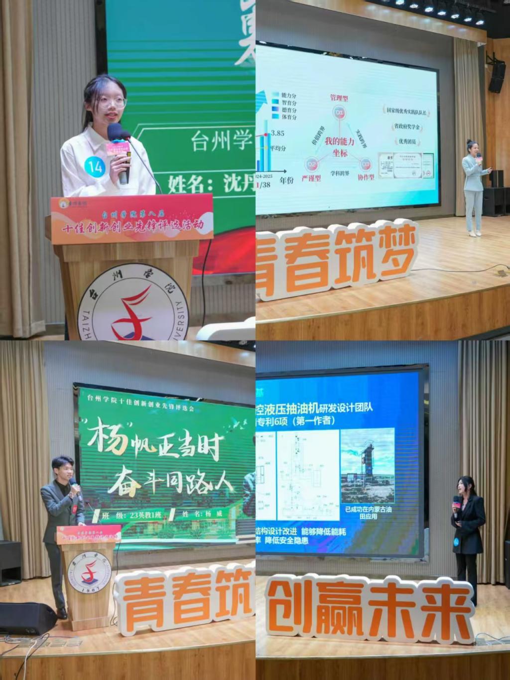 活动现场,29名来自各二级学院的参赛选手分为“创新先锋”与“创业先锋”两组,依次进行精彩的路演展示。每位选手在5分钟时间内通过PPT、视频等形式全面展示了自己的创新创业项目及成果。选手们的展示内容丰富多样,既有前沿的科技创新,也有贴近民生的创业实践,充分展现了台院学子的创新精神和创业热情。