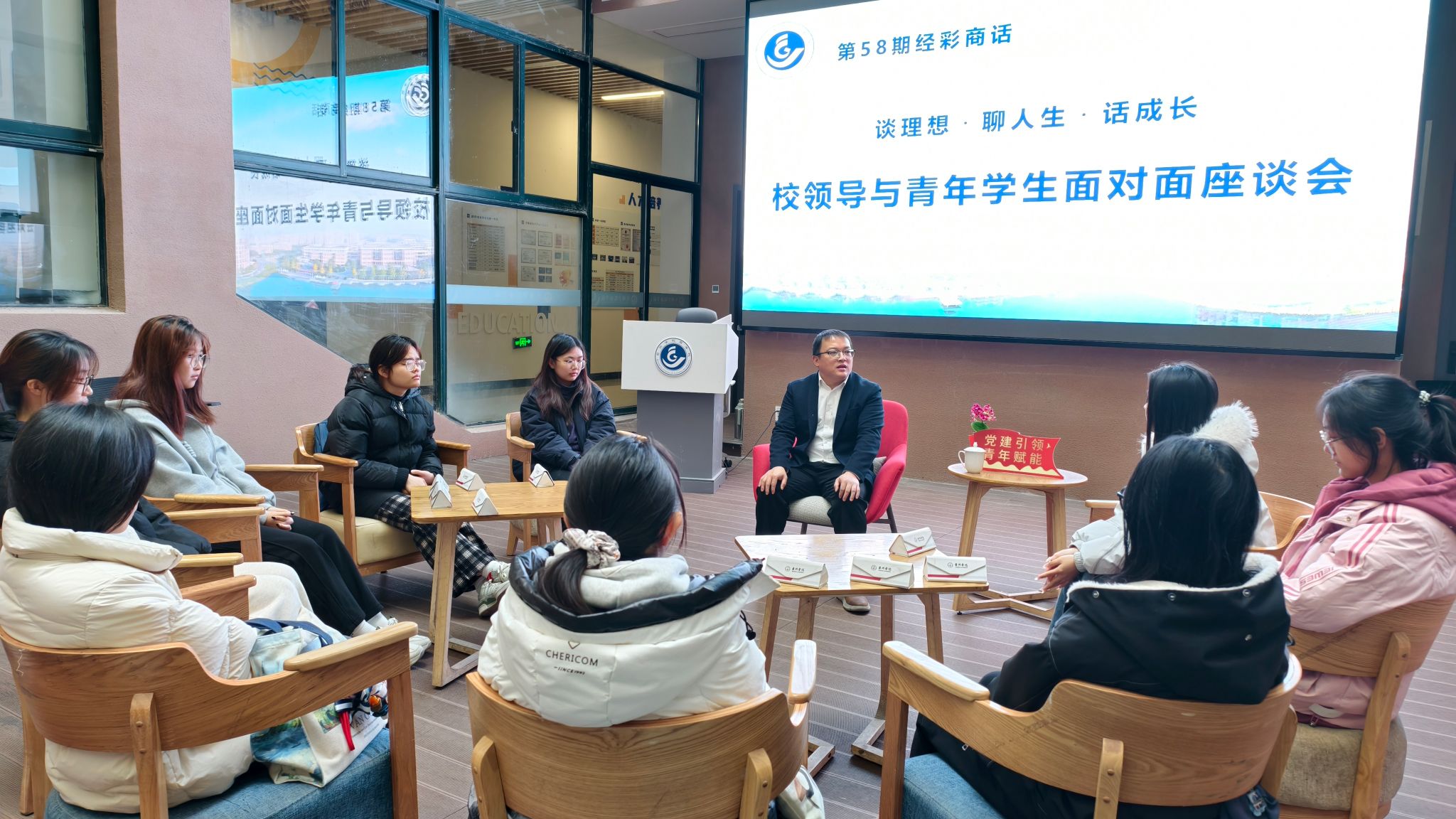 为紧密围绕立德树人根本任务,搭建高层级、有温度的师生对话平台,1月8日上午,商学院在学院大楼中厅成功举办第五十八期“经彩商话”系列活动。本期活动以“谈理想·聊人生·话成长”为主题,特邀学校党委副书记丁一志与十余名青年学生代表进行面对面深度座谈。商学院党委书记马斌、党委副书记陈斌岚、分团委书记项民一同参与。