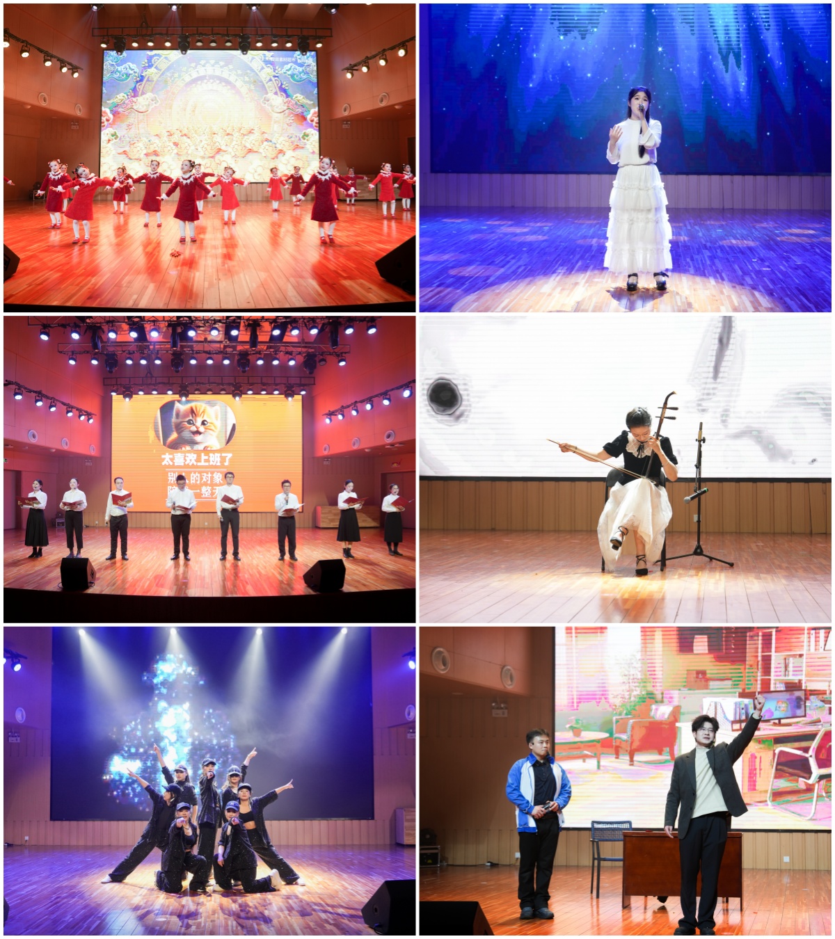 晚会在学校附属心湖幼儿园带来的舞蹈《福气要来到》中开场,舞蹈洋溢着天真童趣,为现场营造了祥和欢乐的氛围。一曲深情款款的独唱《世界赠予我的》,以细腻演绎唤起共鸣,映照出机关人感恩生活、心怀美好的精神质地。朗诵《我爱上班》以幽默诙谐的语调道出真挚朴素的职场心声,传递出机关青年在忙碌中坚守、在奉献中乐业的职业情怀。二胡独奏《太极琴侠》则刚柔并济、意境深远,恰如机关工作张弛有度的节奏与内外兼修的素养。活力四射的舞蹈串烧《Beat it&Dangerous》点燃全场,尽显蓬勃朝气与团队激情。原创小品《重生之我在台院当辅导员》则以真挚感人的剧情,生动呈现了一线思政工作者有温度、有智慧的育人日常,让观众在笑声与感动中加深了对立德树人使命的理解。