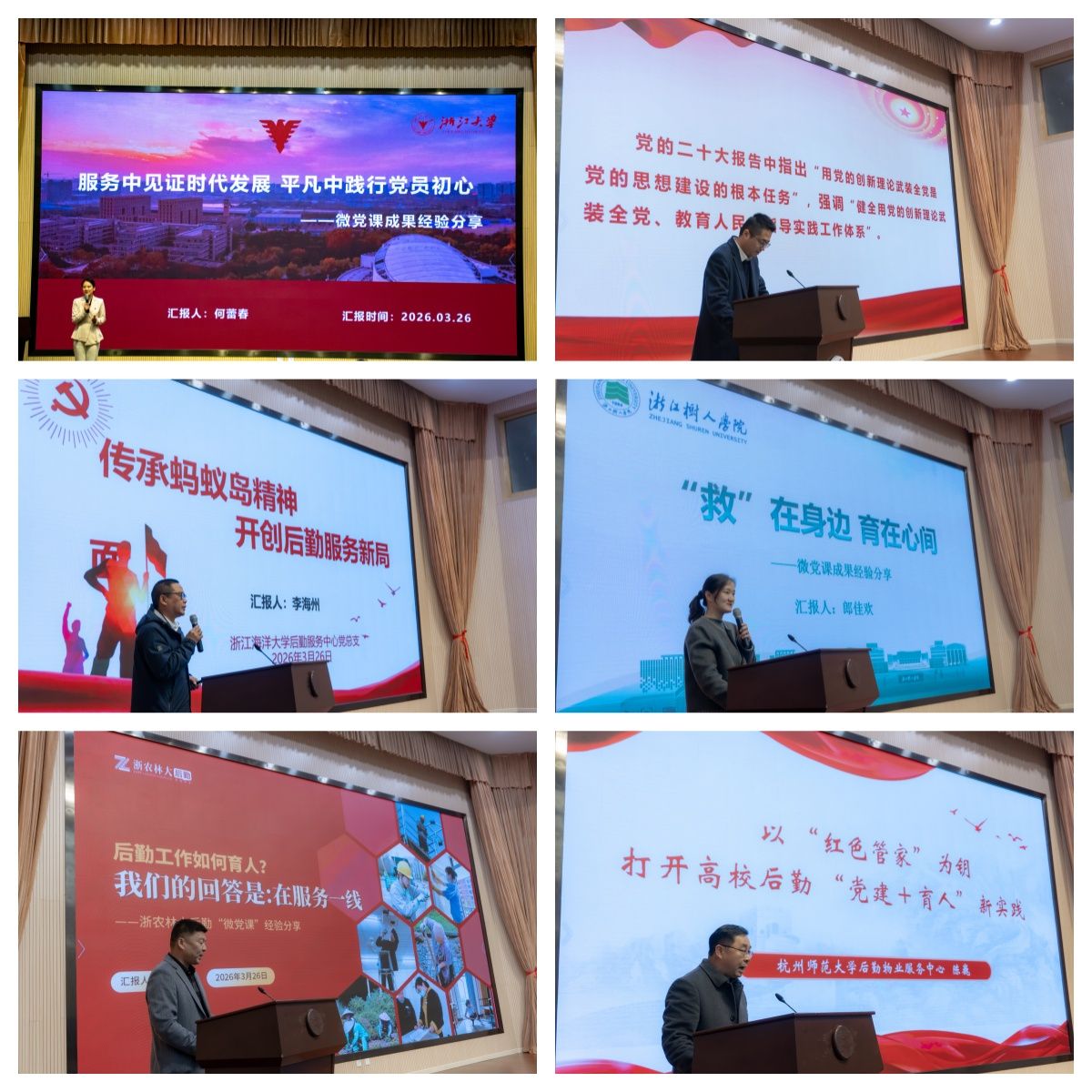 会上,台州学院原党委副书记金先龙作《夯实基础、全面发力 奋力开创中国式现代化建设新局面--学习贯彻党的二十届四中全会精神》讲座,讲座内容丰富、讲解生动、论述精辟,为参会人员带来了一堂有理论深度、精彩生动的思政大课;浙江大学、浙江工商大学、浙江海洋大学、浙江树人学院、浙江农林大学、杭州师范大学等高校结合各自特色工作亮点做了微党课成果经验分享。大会还对35个浙江省高校后勤微党课大赛获奖作品进行了颁奖。