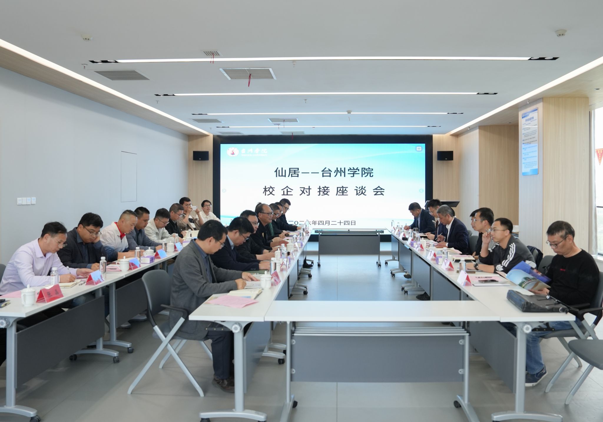 为进一步深化校地战略合作,精准对接地方产业技术创新与人才培养需求,助力仙居县经济社会高质量发展,4月24日,仙居—台州学院校企对接座谈会在我校椒江校区顺利召开。仙居县委常委、仙居经济开发区党工委书记吕振宏,我校副校长韩得满出席会议,校地双方相关部门、重点企业负责人参加座谈。