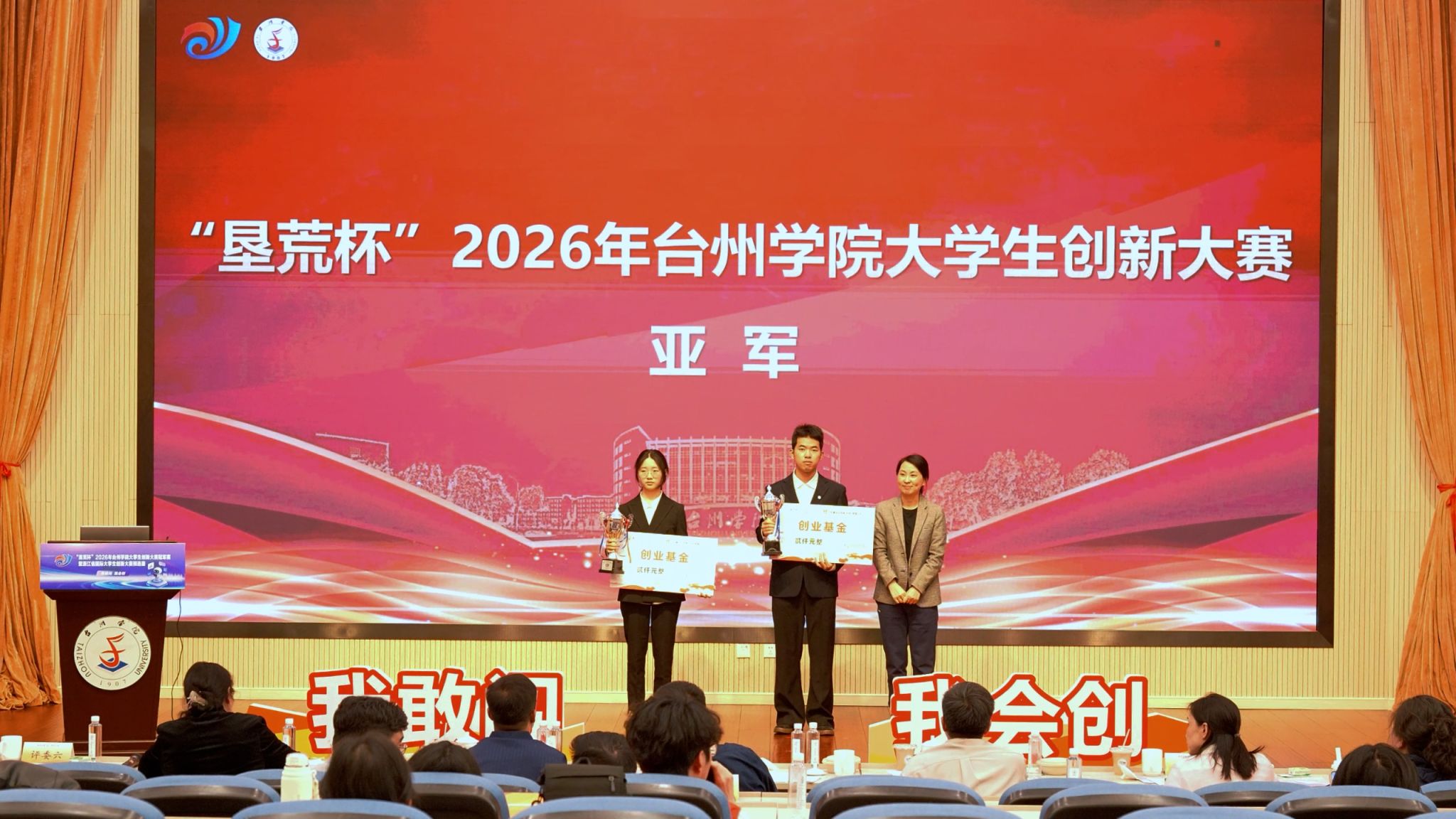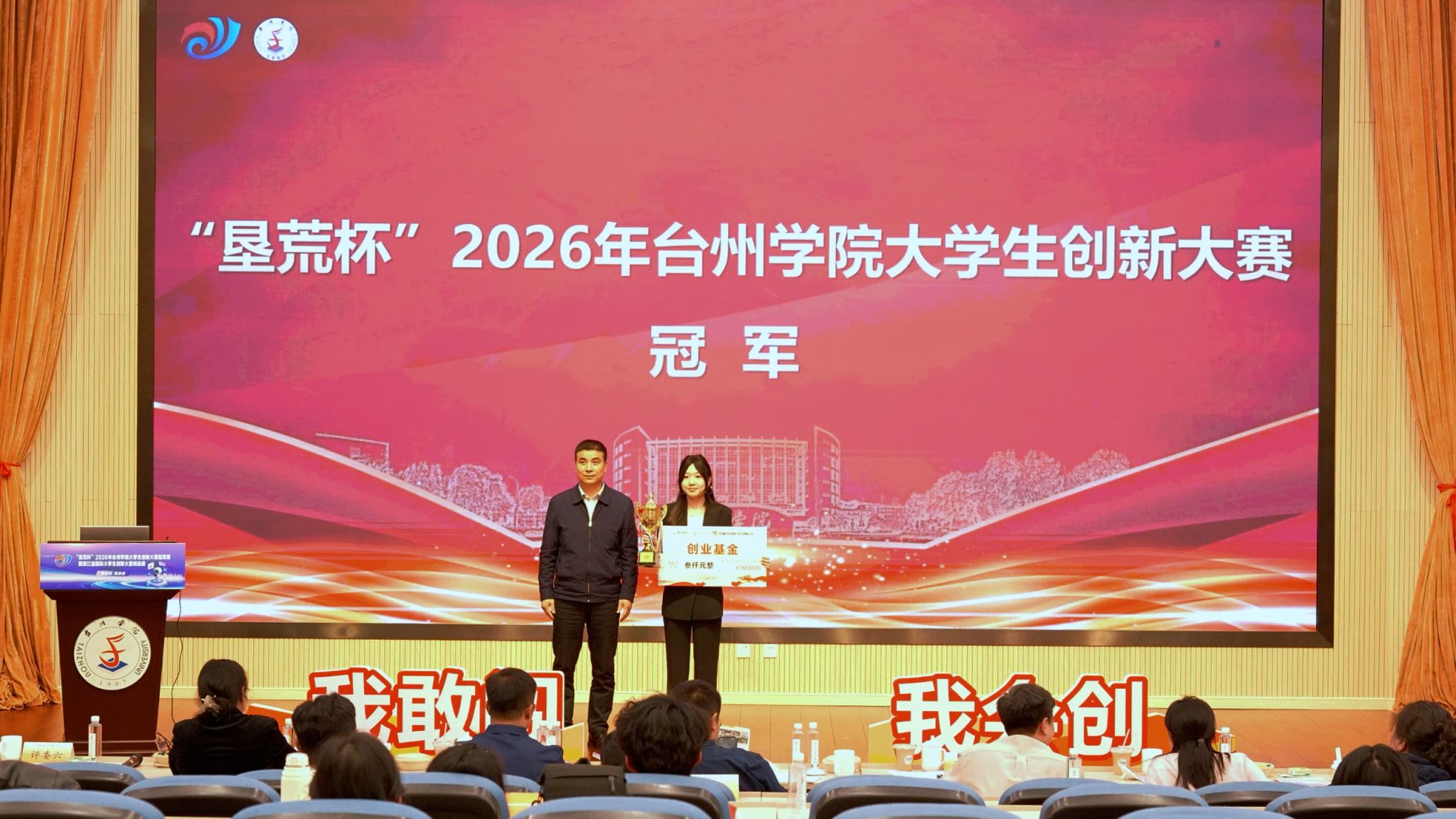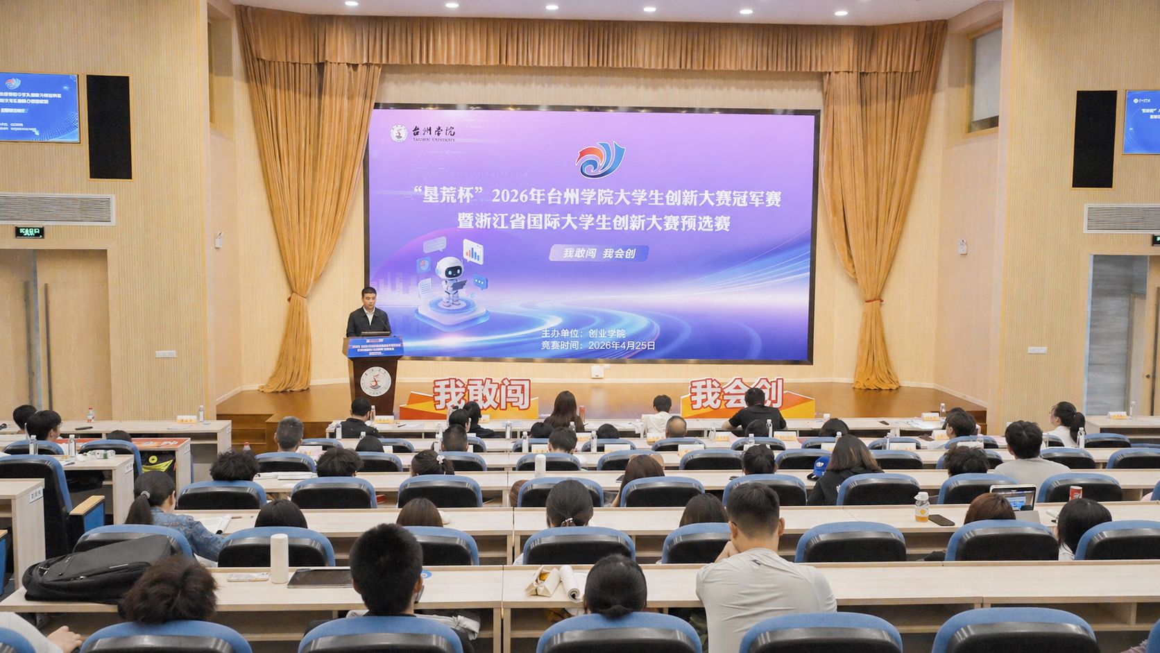 4月25日下午,“垦荒杯”2026年台州学院大学生创新大赛冠军赛暨浙江省国际大学生创新大赛(2026)预选赛在椒江校区国际会议厅成功举办。校党委委员、宣传部部长蔡海江,创业学院院长周瑶,校团委书记潘垚出席,校双创指导委员会委员及各二级学院师生代表参加此次活动,省内外国赛指导专家担任本次大赛评审。