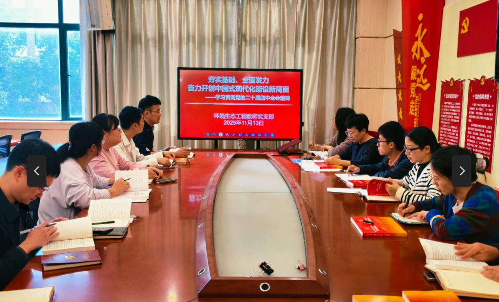 活动中,全体党员集中学习了习近平总书记在全球妇女峰会上的重要讲话精神及在《求是》杂志发表的关于推动落实全球发展倡议的重要文章精神,始终坚持党的全面领导,做好服务国家战略,推动高质量发展。党支部书记围绕“夯实基础、全面发力,奋力开创中国式现代化建设新局面”主题,带领全体党员深入学习党的二十届四中全会精神,并结合“十五五”时期经济社会发展目标开展交流讨论。全体党员结合环境生态工程专业特点,围绕课程思政课堂教学改革展开研讨,从思政元素凝练、教学案例设计、典型章节建设等方面谋划下一步申报与实施路径,推动立德树人根本任务落实落地。