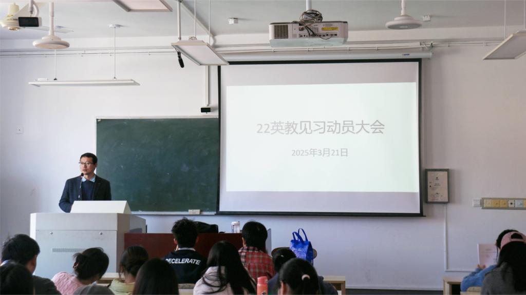 3月21日,外国语学院于1310教室举办2022级英语教育见习动员大会。会议由英语教育系主任马俊周博士主持,学院指导老师和2022级英语教育学生参加。