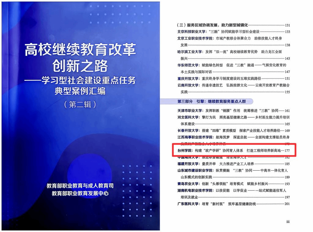 近日,教育部职业教育与成人教育司正式发布《高校继续教育改革创新之路——学习型社会建设重点任务典型案例汇编》(第二辑)。该汇编从第二批269个继续教育领域学习型社会建设重点任务中,遴选出52个典型案例,旨在展示高校在继续教育内涵建设、促进全民终身学习等方面的创新探索与实践成果。我校申报的《构建“政产学研”协同育人体系 打造工程师培养新高地》案例成功入选,该案例依托校长、党委副书记乐传永牵头,教务处、工程师学院以及继续教育学院联合申报的“三教统筹协同创新任务”培育建设项目-《跨界融通培养工程人才赋能学习型社会建设》。