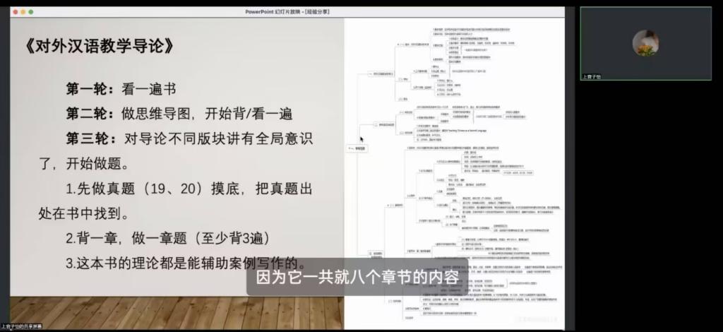 对于专业课的备考,上官子怡也提出了详细有效的建议。针对汉语基础,她提出了“背书+做题+导图回顾”的学习模型,强调要将学习指导、思维导图与题目结合,在反复记忆的过程中梳理知识点并查漏补缺,以此扩展自身知识面,并且使自身具备完整的逻辑框架的同时,锻炼圆融严密的思维。针对汉语国际教育中的《中国文化要略》,她认为应该应用“背诵+模拟题”的模型,在重复背诵的过程中,不断整理细碎零散的知识点;而对于《对外汉语教学导论》,她再次建议大家将思维导图应用于背书、做题的过程之中,并整理出合适的案例分析模板,以应对卷面考试。
