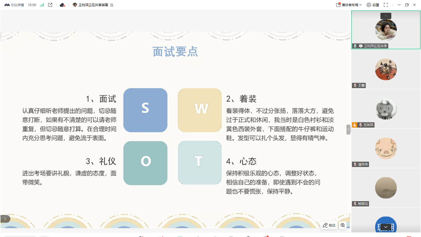 活动开场,刘璇学姐以自身经验为切入点,指出心态与细节是复试成功的关键因素。备考时积极自我暗示;面试前模拟突发情况,面试时用小缺点拉近距离,注重逻辑表达和眼神交流;把中英文自我介绍和导师课题结合,关注学术前沿。王钧萍建议用SWOT分析法进行复试准备;英语面试注重流畅,可录音自查,熟悉高频问题关键词;专业课遇到难题灵活迁移知识;着装得体,注意考场礼仪。潘传伟指出精准备考关键在于联系直系学长学姐了解考察重点;英文自我介绍精简真实,突出关键信息。郑熙强调简历用STAR法则描述经历,清晰展现情境、任务、行动及成果,避免简单罗列奖项;提醒大家复试前规律作息,保护备考隐私。