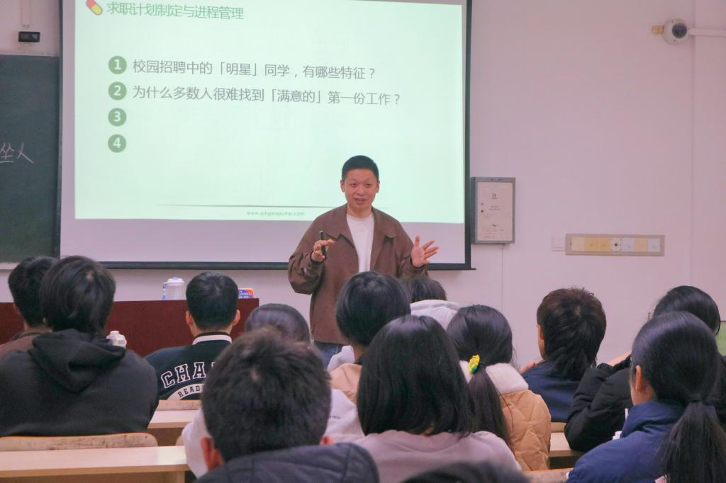 4月1日晚,人文学院于1310教室成功举办第二十五期人文创客论坛。青蛙泵业股份有限公司人事部招聘经理、商学院24级企业班主任蒋良耀担任主讲人,与学生分享求职策略与职业规划经验。
