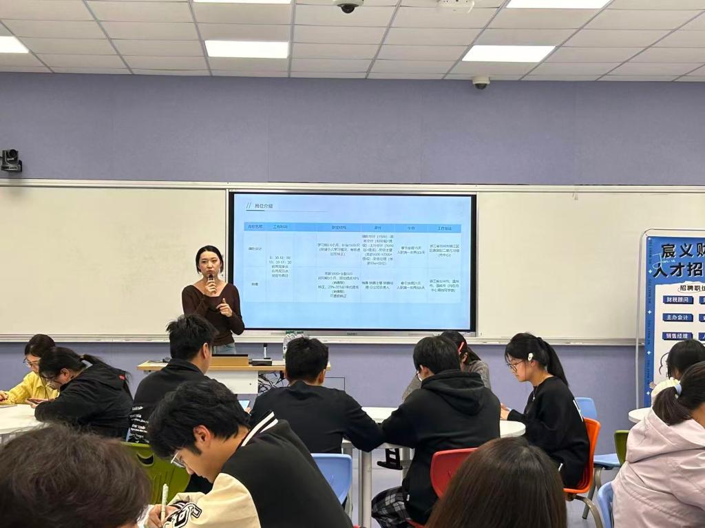 肖梦婷向在场同学详细介绍了宸义财务的发展历程、企业文化、业务领域以及未来的战略发展规划,使同学们对公司有了全面的了解。随后,重点解读了本次校园招聘计划,主要面向应届毕业生开放辅助会计和销售两大类岗位。她就岗位职责、任职要求、公司完善的人才培养体系、具有竞争力的薪资福利待遇以及清晰的职业晋升通道等内容进行了详细说明。