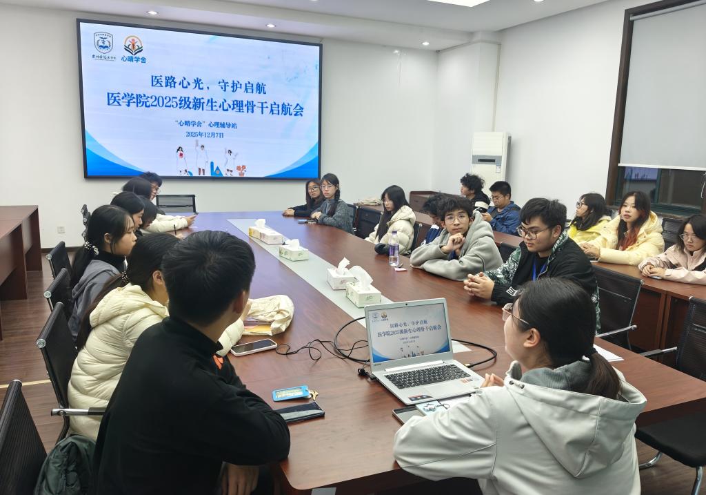 为进一步凝聚学院心理健康服务合力,织密织牢2025级新生心理健康防护网,12月7日晚,医学院在A305会议室召开新生心理骨干启航会。本次会议以“医路心光,守护启航”为主题,旨在为心理骨干明晰工作职责、赋能专业能力。来自各新生班级的心理委员,团学心理部干部及新生寝室长代表等近40人参会。