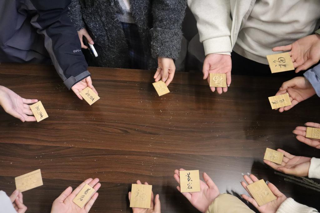 体验环节中,罗文驰现场演示“以刀代笔”的雕刻技法,强调运刀的轻重缓急直接影响作品神韵。他手持刻刀在竹簧上勾勒山水轮廓,纤毫毕现的技艺令同学们赞叹不已。在其指导下,同学们从握刀、运刀学起,专注完成简易竹雕作品,沉浸式感受传统工艺的魅力。交流中,大家围绕技艺传承与创新设计踊跃提问,罗文驰一一作答,并分享自己“让传统被看见”的坚守初心。