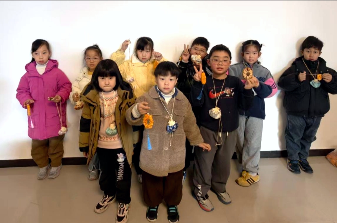 孩子们手持橘子手串和香囊合影留念